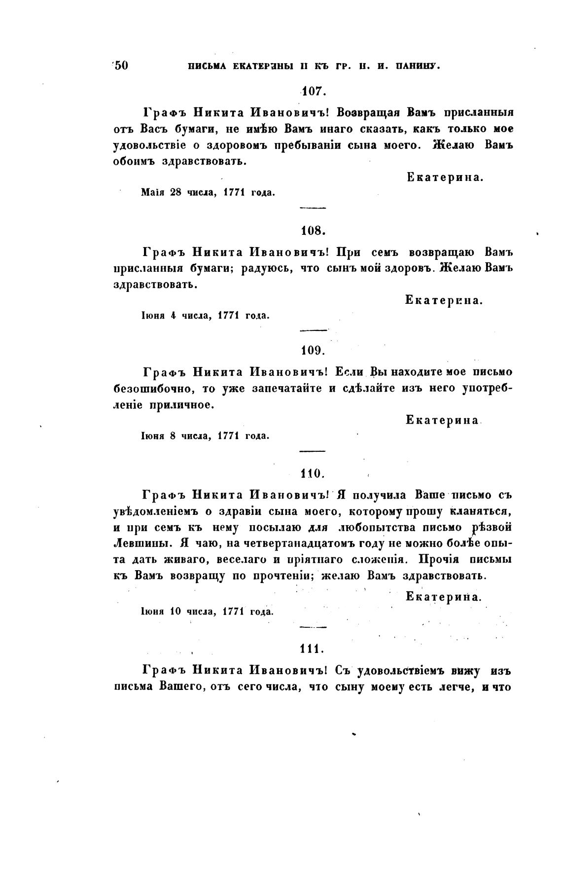 НИСЬМА ЕКАТЕРаны П КЬ гр. Н. И. ПАНИНУ.