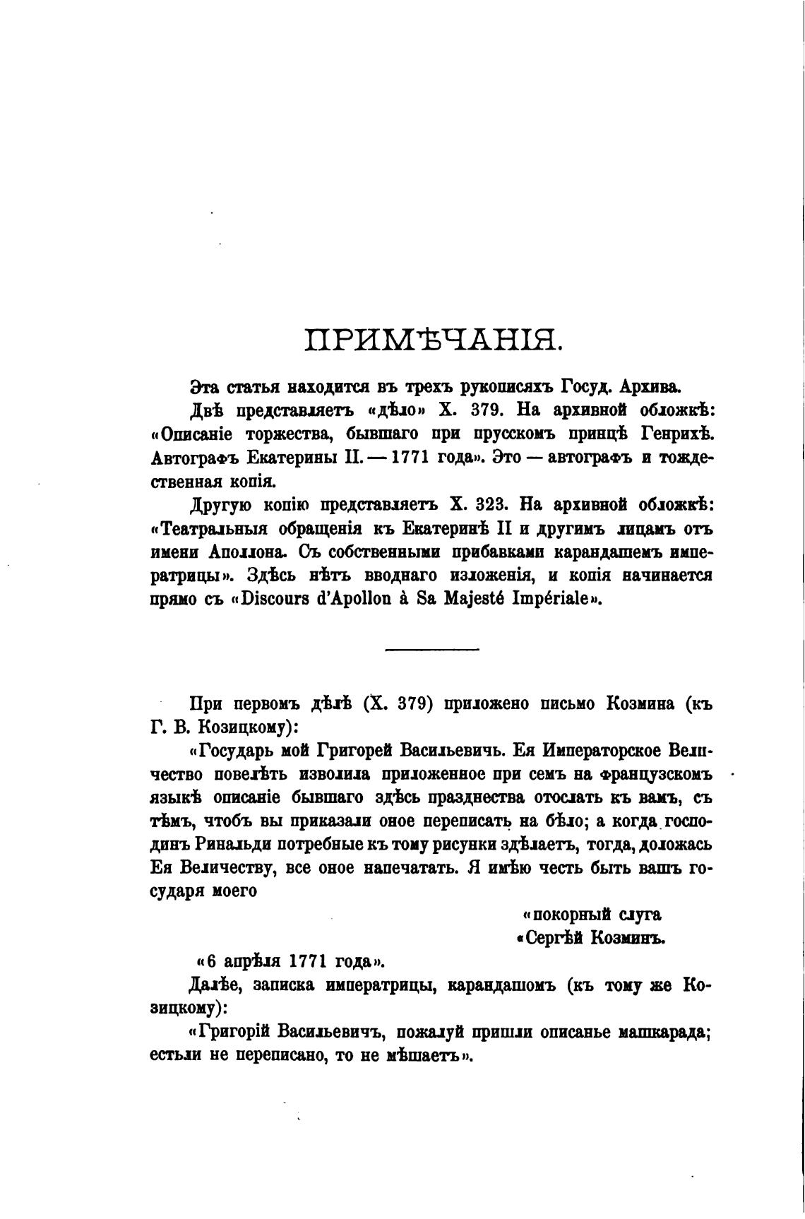 «Театриьныя кь Екатерин•ђ II и другимъ хицамъ отъ