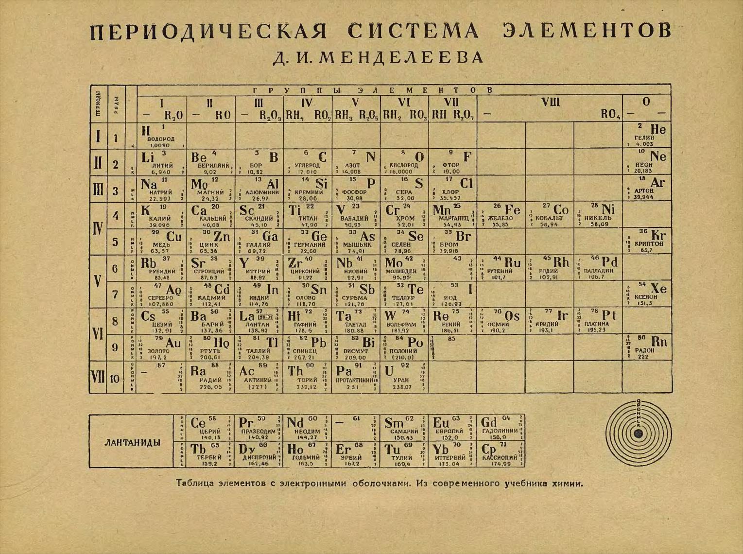 Таблица элементов с электронными оболочками.