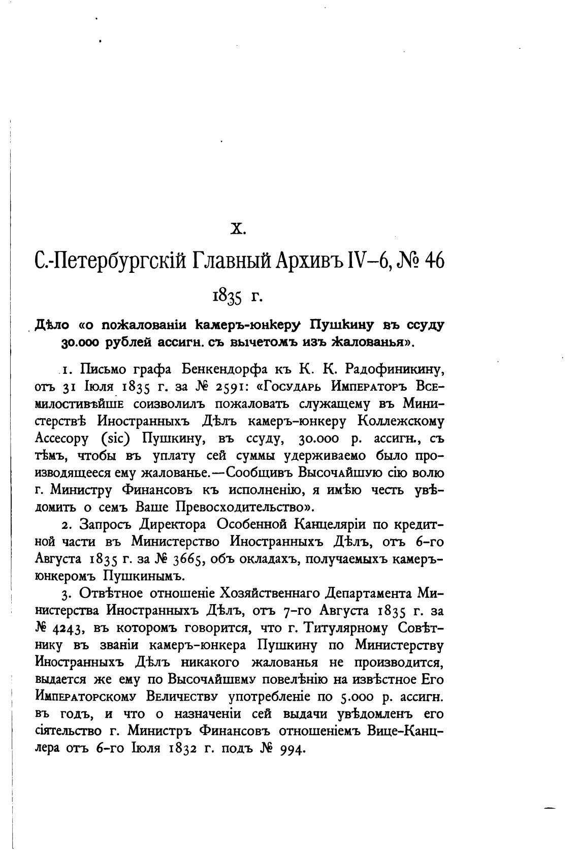 Ассесору (sic) Пушкину, въ ссуду, 30.000 р. ассигњ, съ