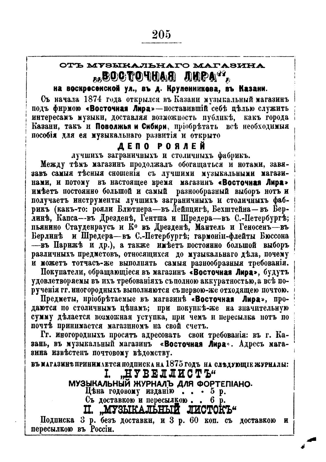 Съ начала 1874 года открылся въ Казани музыкальный магазинъ