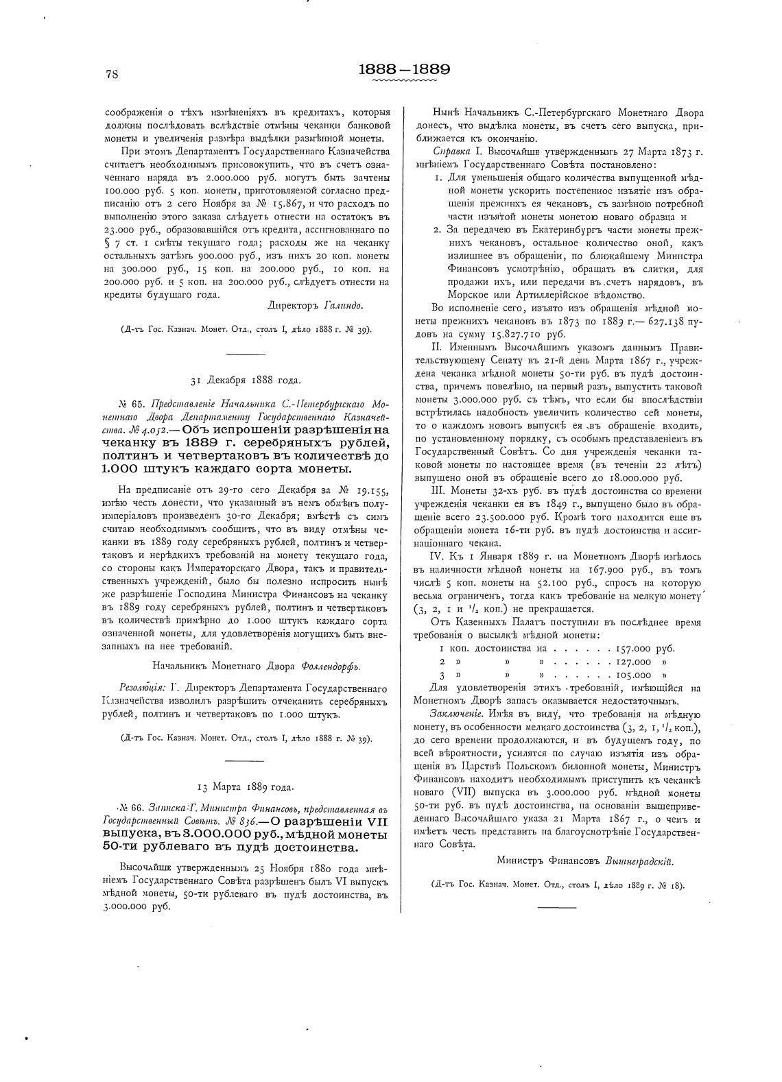 (Д-т-ь Гос. Казнач„ Монет. Отд., столь Т, д±ло 1888 Г. 39).