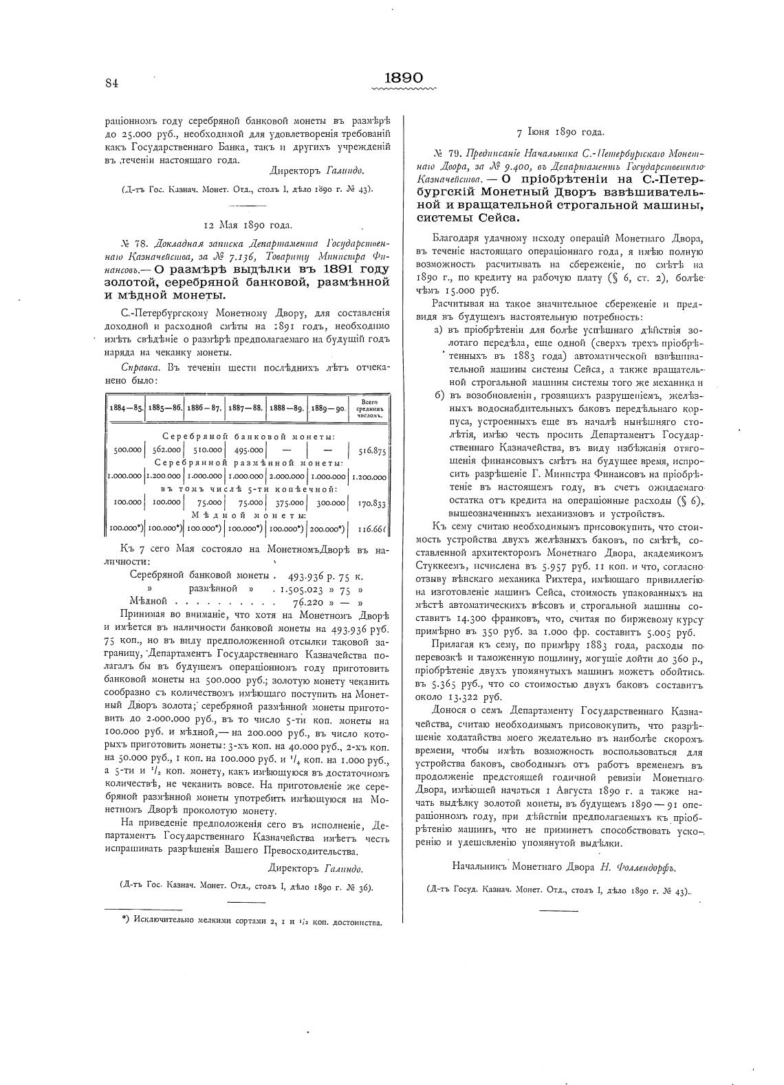 (Д-тъ Гос. Казнач„ Монет. Отд„ столь 1, д•Кло 1890 г. 36).