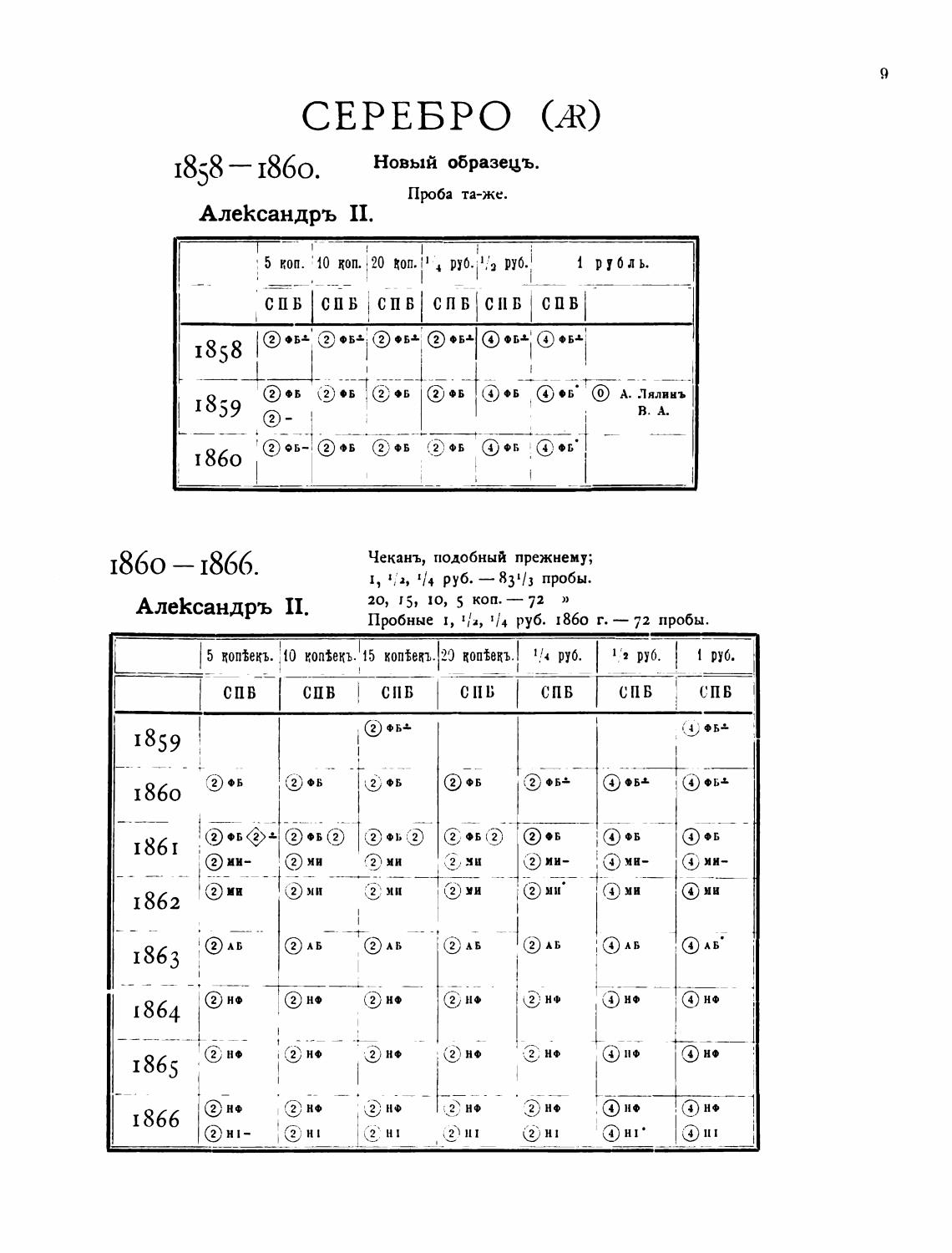 Пробные 1, I{3, 4 руб. 1860 г. — 72 пробы.