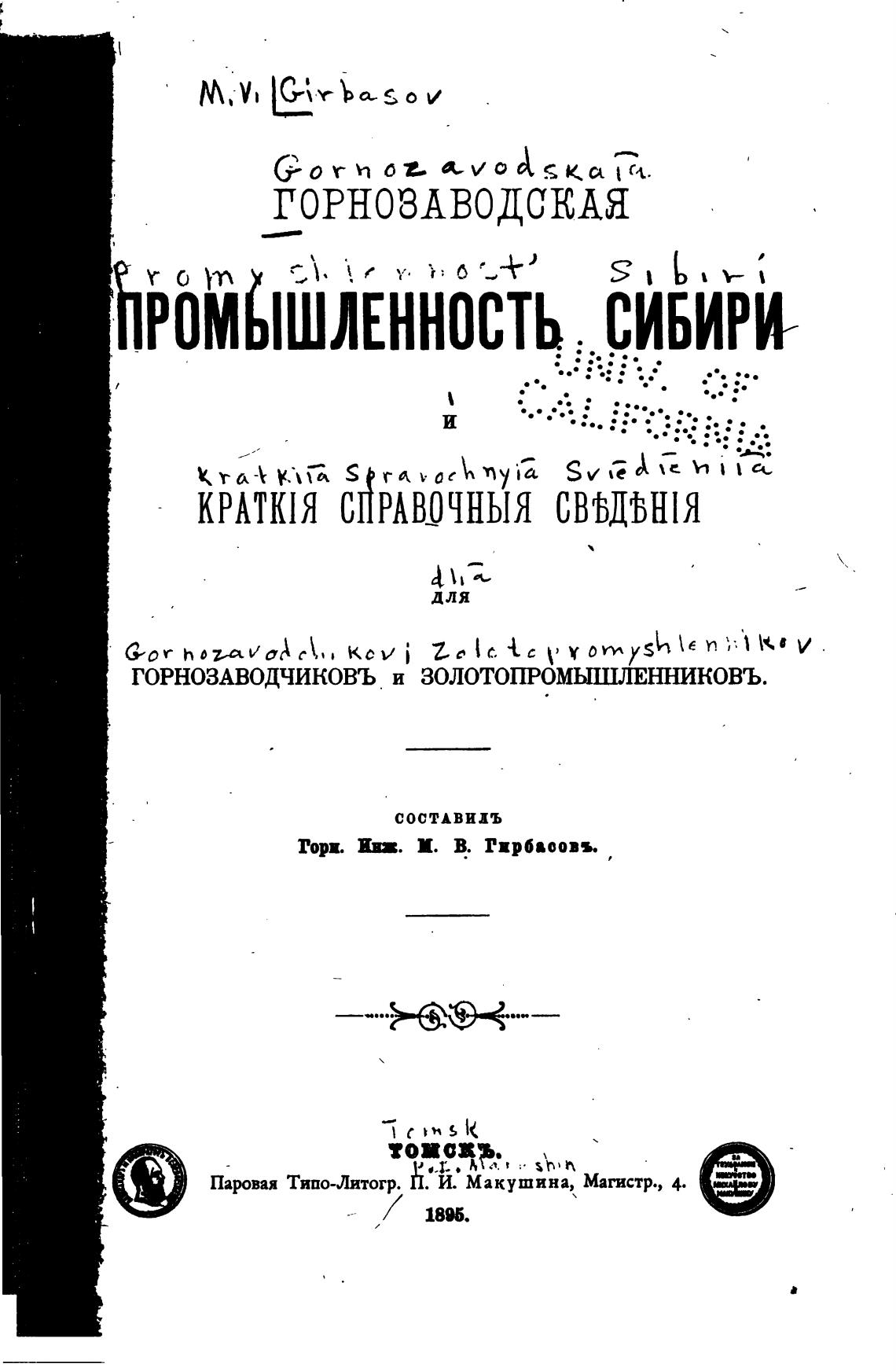 ГОРНОЗАВОДЧИКОВЪ и ЗОЛОТОПРОМЫШЛЕННИКОВЪ.