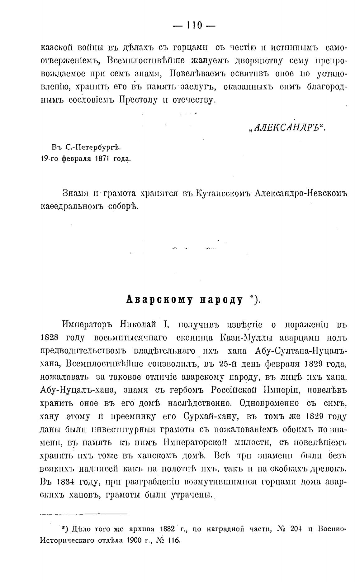 Знамя и грамота хранятся въ Кутаисскомъ Алексапдро-Невскомъ