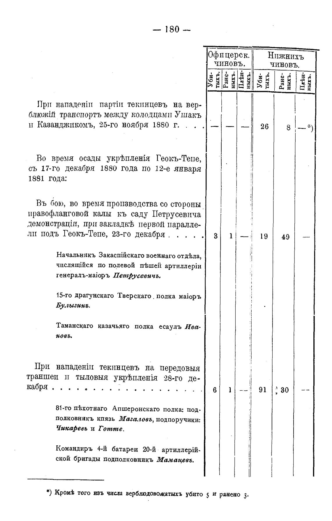 *) Кром± того изъ числа верблюдовожатыхъ убито 5 и ранено З.