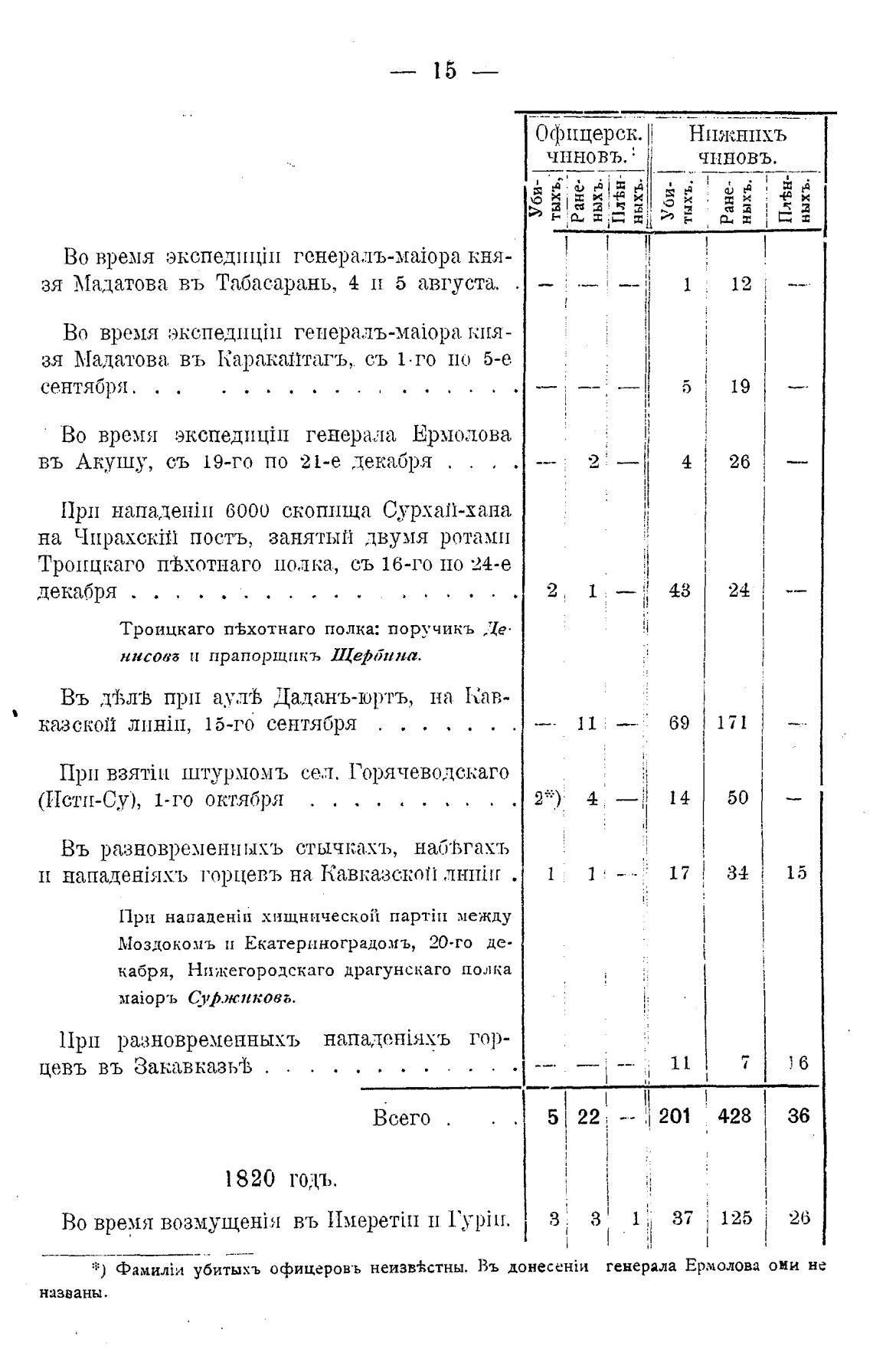 * ) убитыхъ офицеров•ь неизв±стны. Въ донесек-йл генерала Ермолова они не
