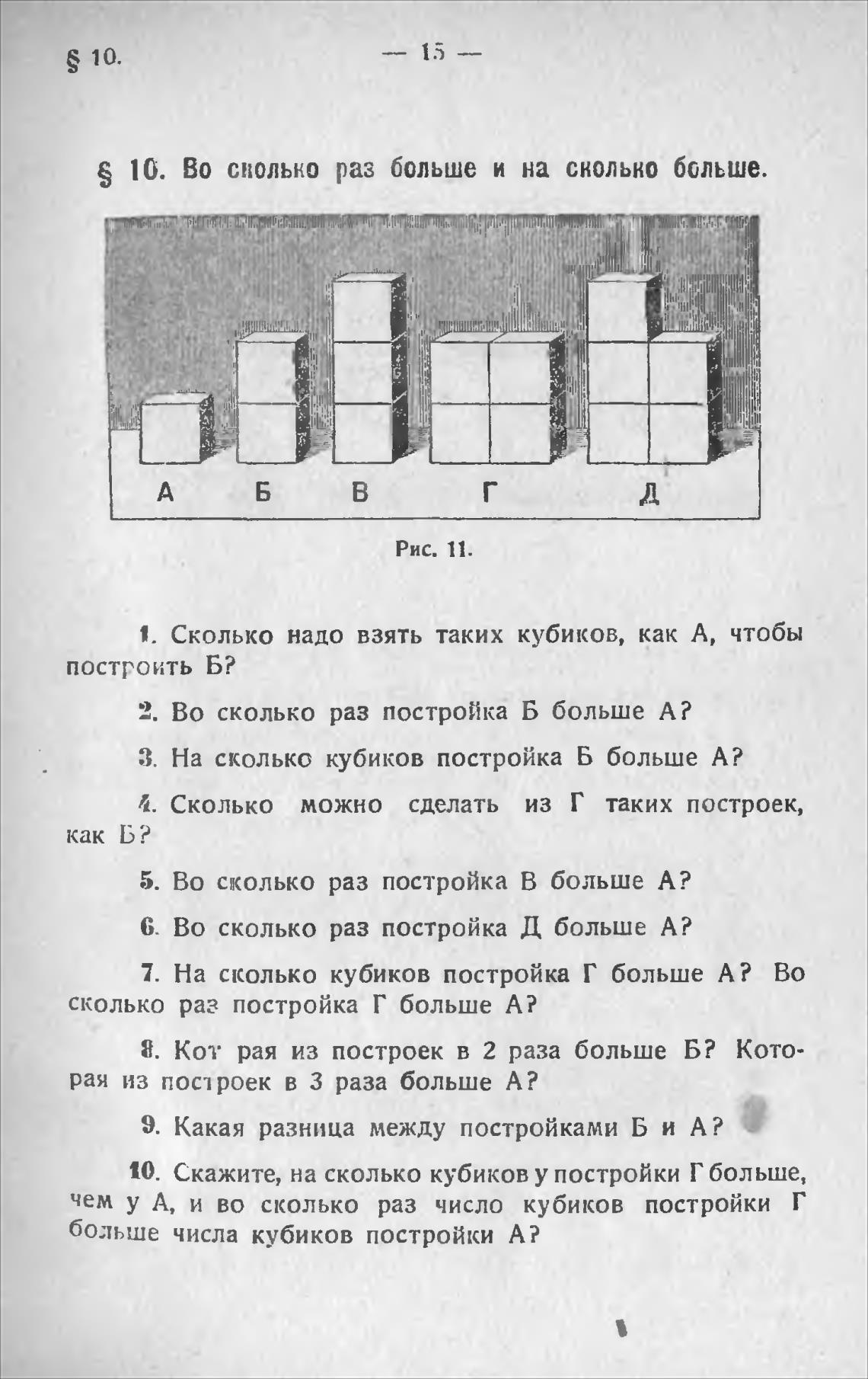 10. Скажите, на сколько кубиков у постройки Г больше,