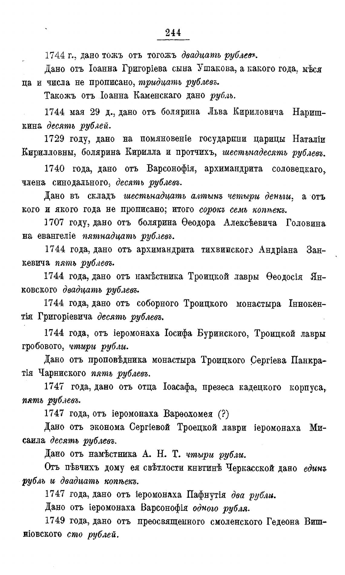1744 года, дано отъ намеЬстника Троицкой лавры Ян-