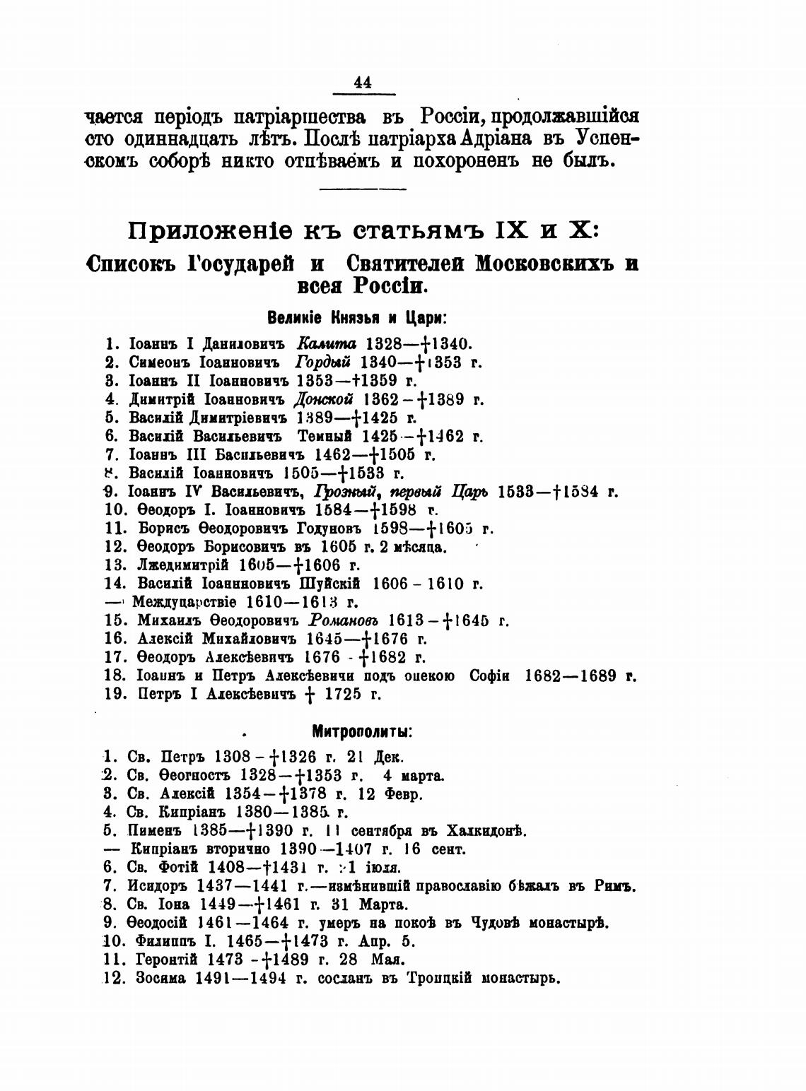 Списокъ 1'осударей и Святителеи Мосвовскихъ и
