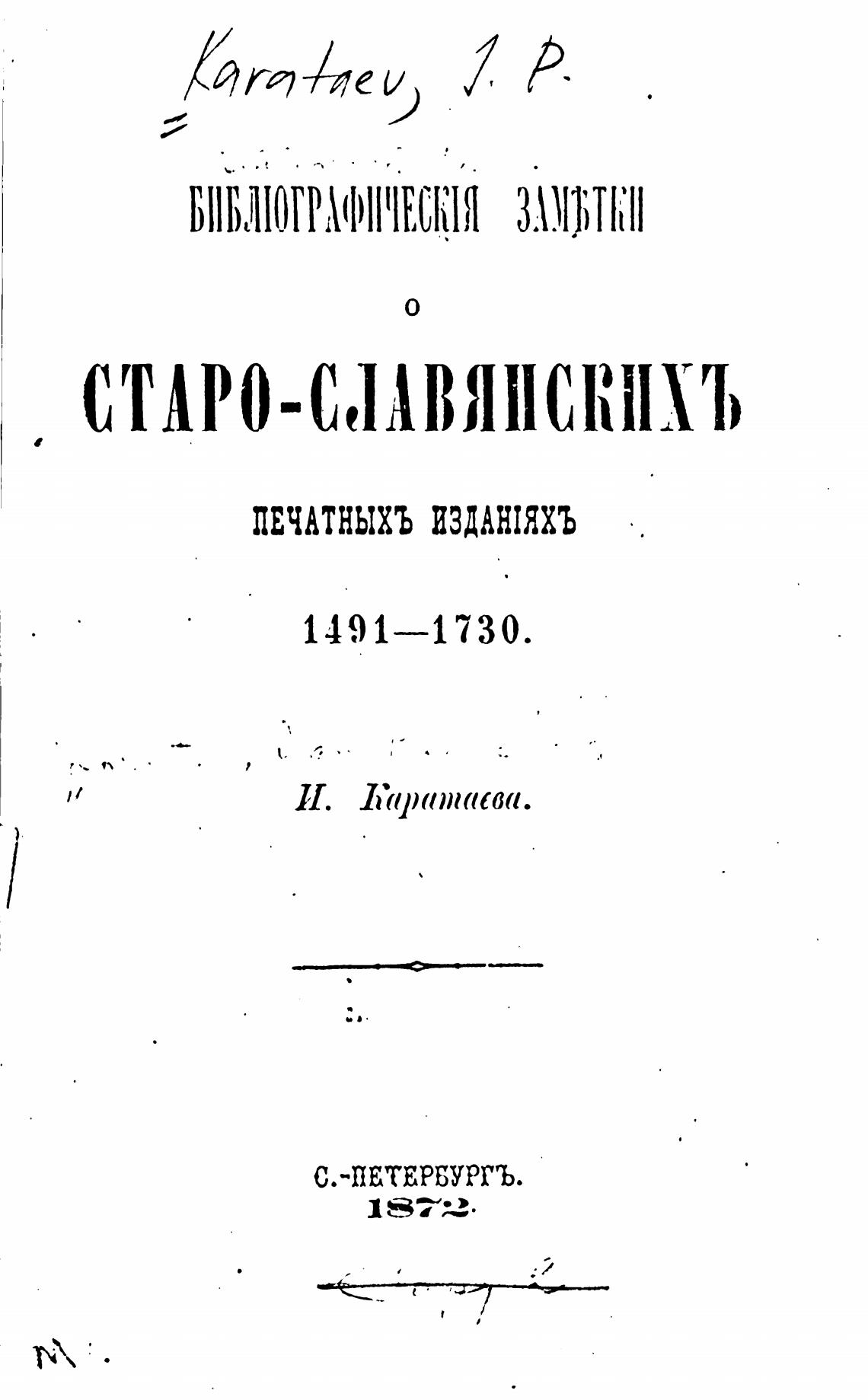 Библиографические заметки о старо-славянских печатных изданиях 1491-1730. - Каратаев И. П.