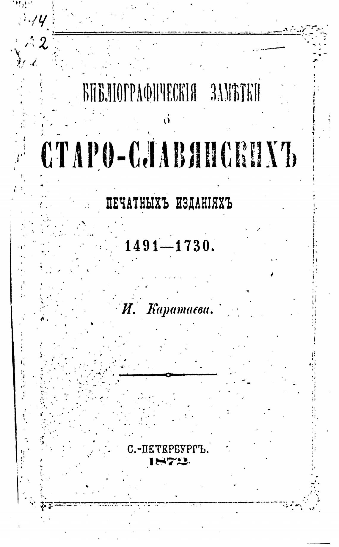 Библиографические заметки о старо-славянских печатных изданиях 1491-1730. - Каратаев И. П.