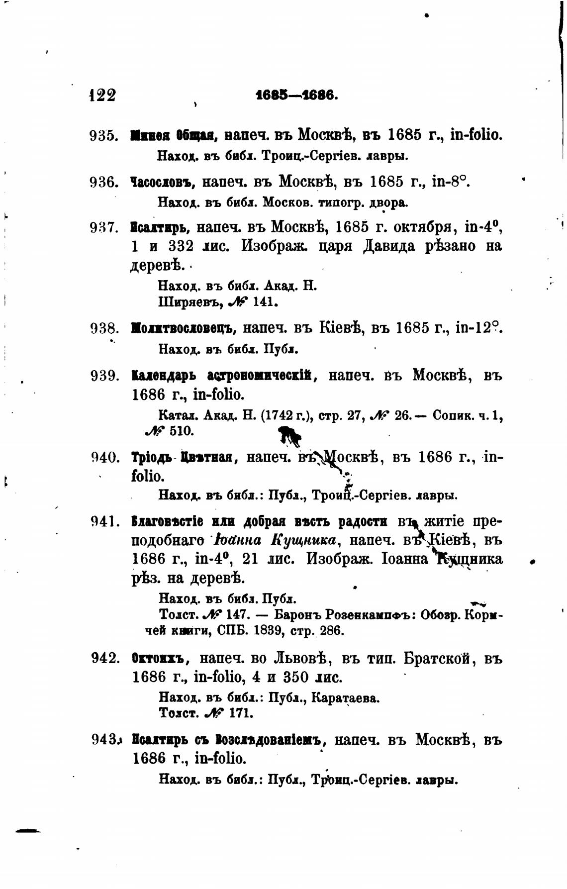 Часоспвъ, напеч. въ МОСКА, въ 1685 г., in-80.