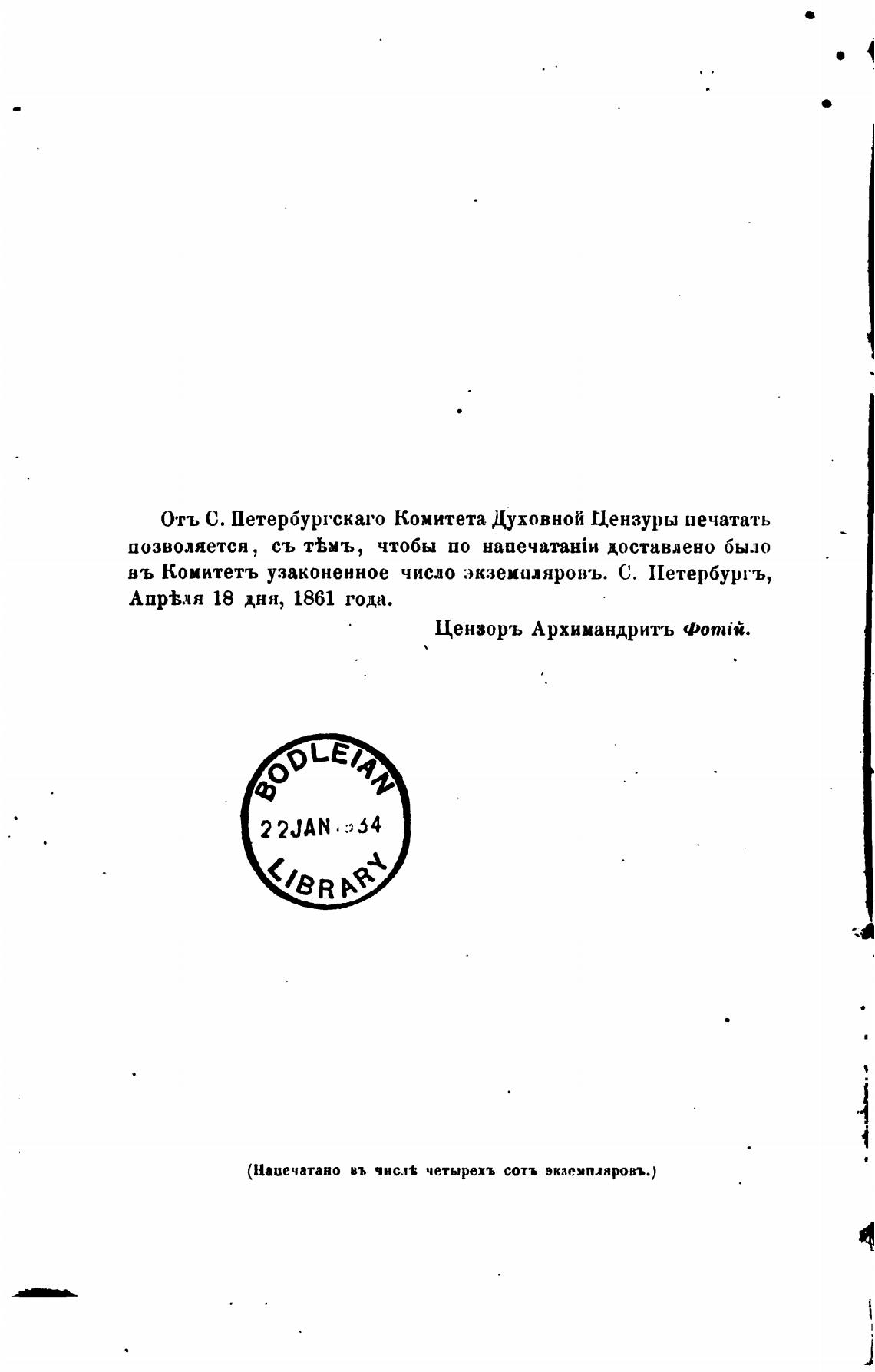 (Напечатано въ чнсл« четырехъ сотъ экземплярвъ.)