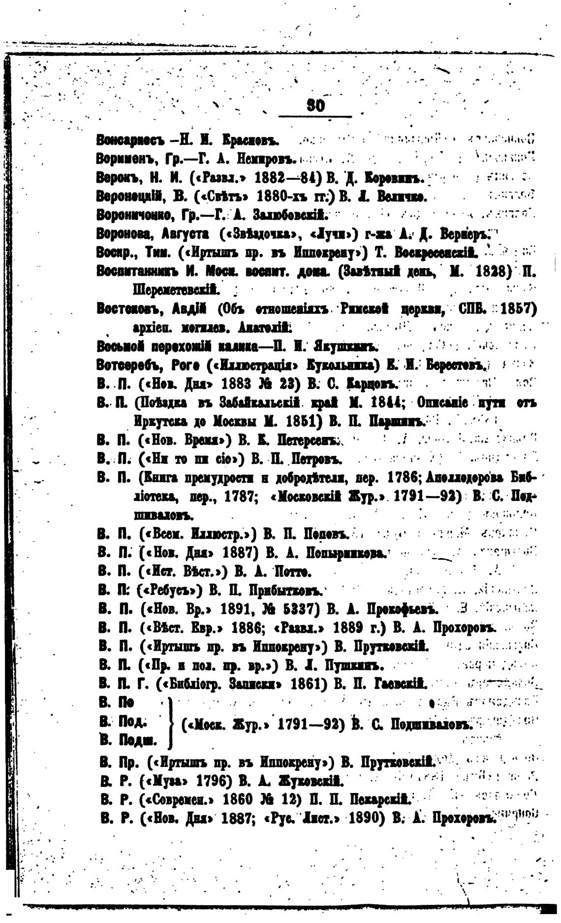 В. Р. («Нов. Ди» 1887; «Рус. 'Ип.» 1890) В; А. Пухороп.