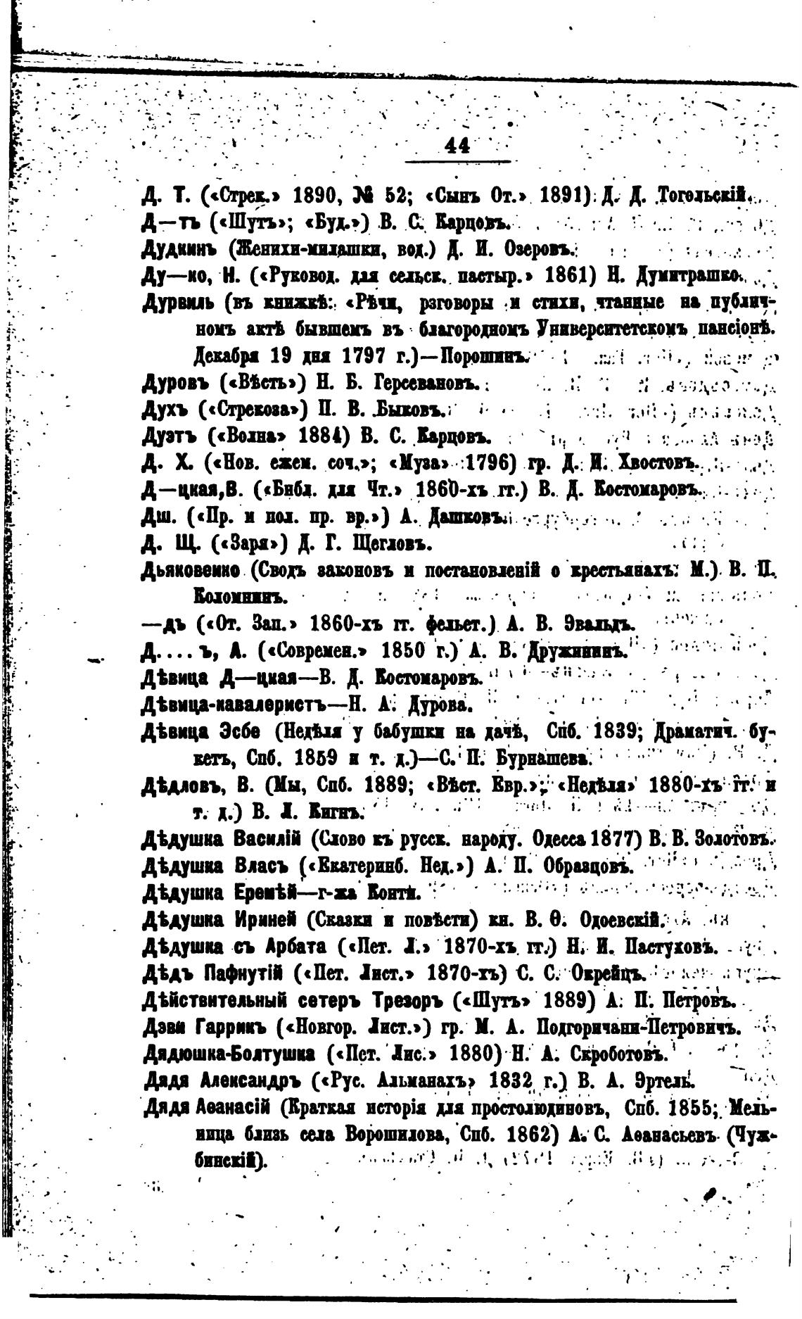 Д. Т. («Огрев» 1890, Х 52; «сыть от.» 1891). Д. Д.