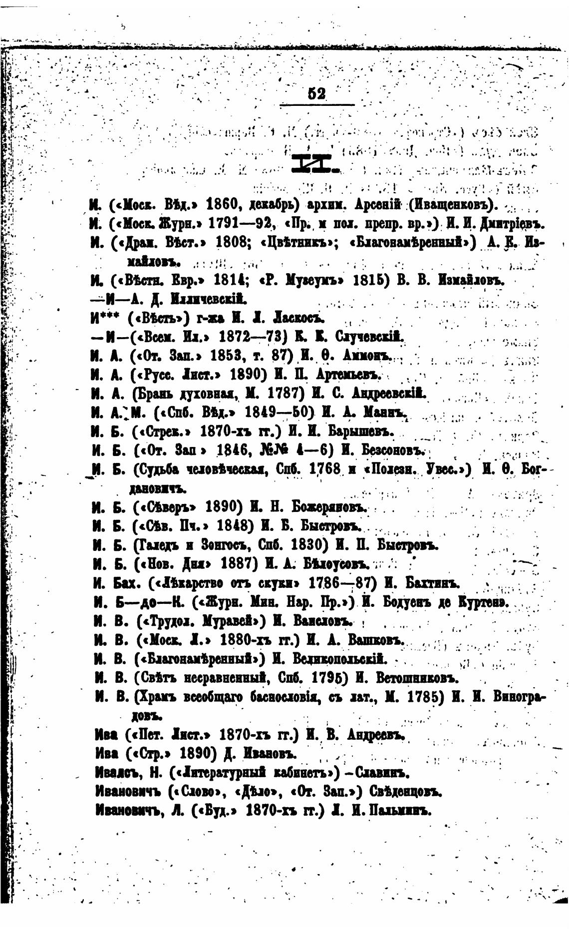 И. («Мосв Журн.» 1791—92, «Пр., пи. врпр. вр.») И. И. Днит—.