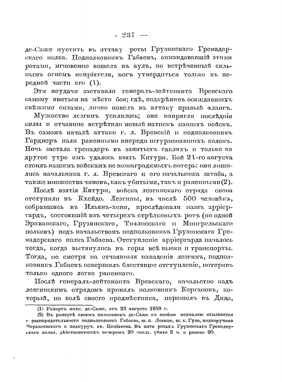 (2) Въ рапорт% своемъ полковникт. де-Саже ст, особою похвалою отзывается