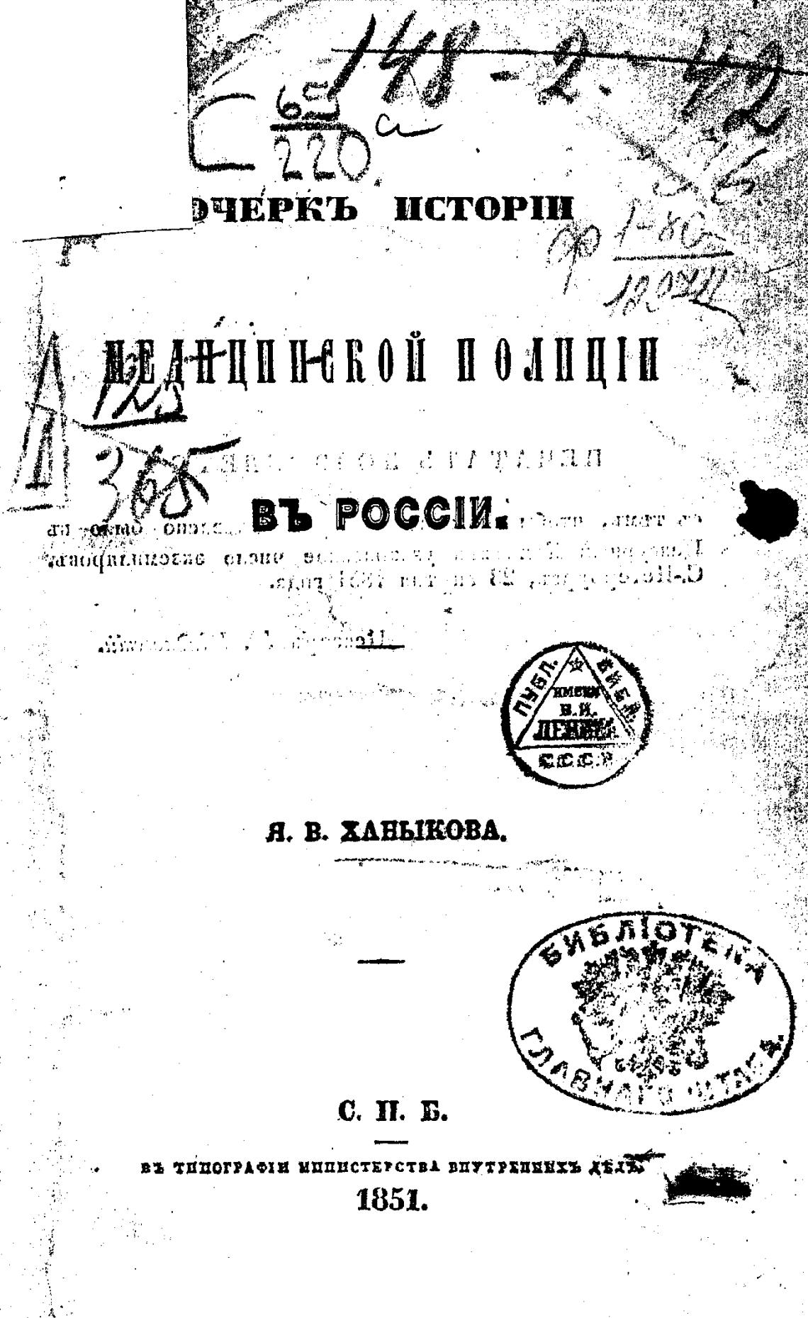 Очерк истории медицинской полиции в России. - Ханыков Я. В.