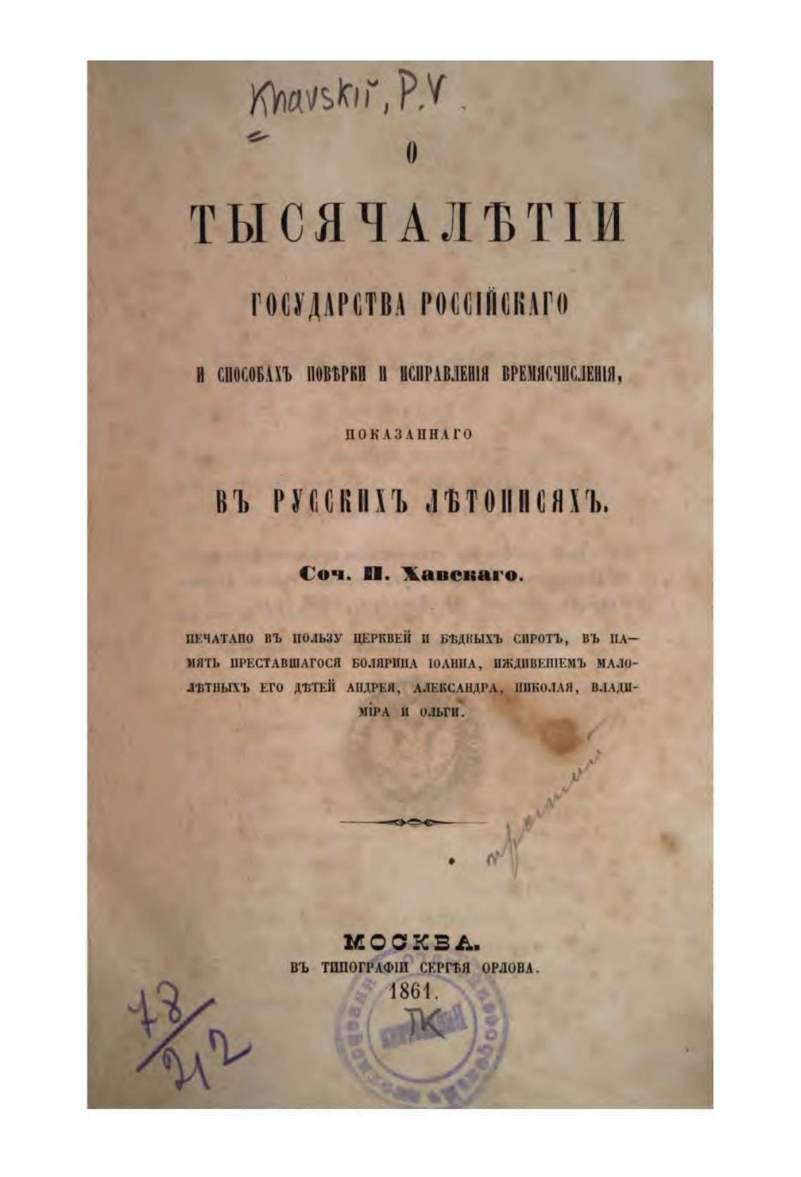 ПЕЧАТАНО ВЪ пользу ЦЕРКВЕЙ И Вт;дКЫХЪ СИРОТЪ, ВЪ ПЛ—