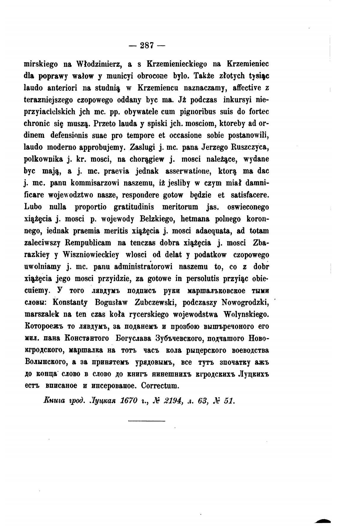 marszalek па ten czas Ко*а rycerskiego wojewodstwa Wolynskiego.
