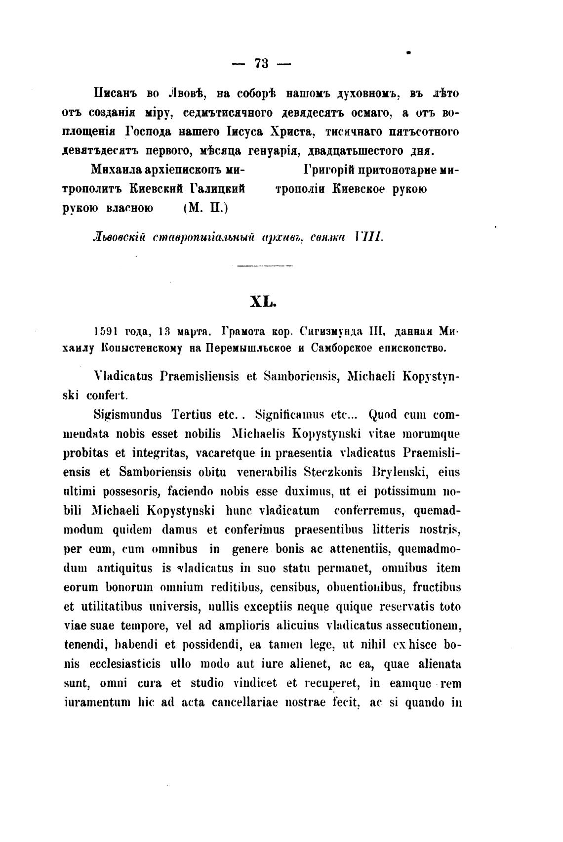 1 591 года, 13 марта. Грамота кор. Сигизмунда III, данная Ми•