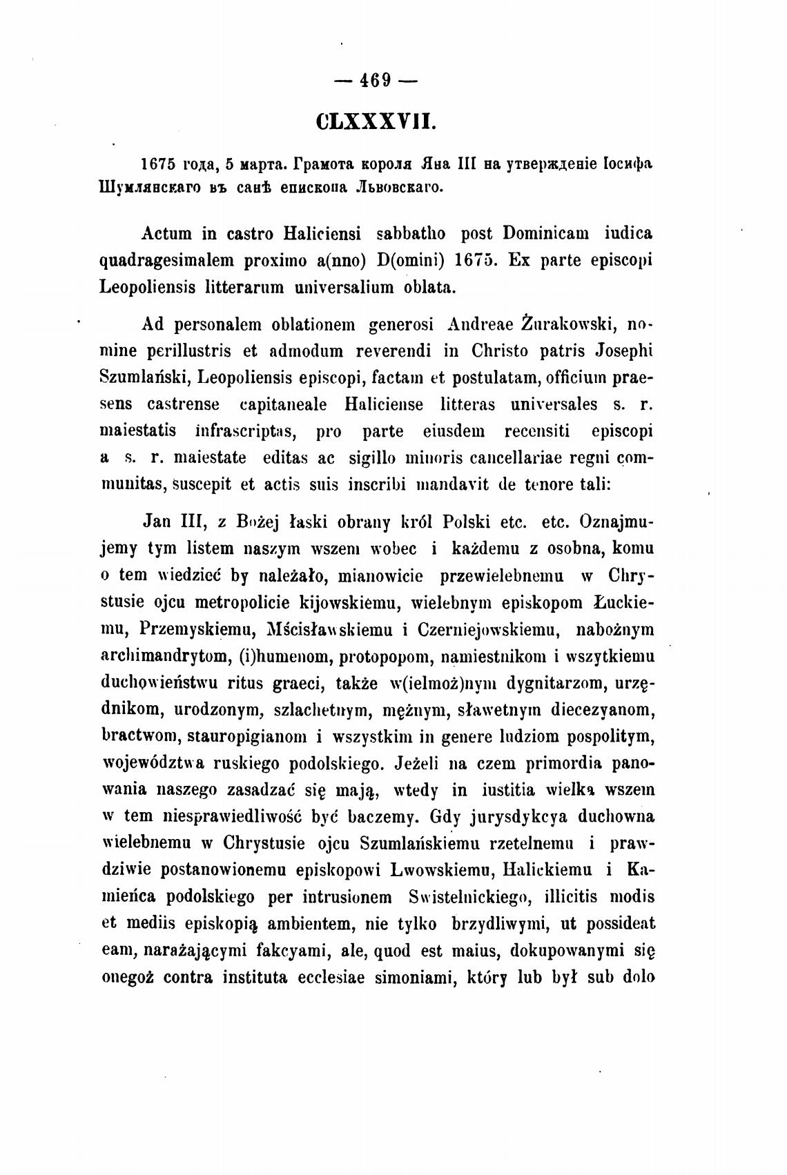 1675 года, 5 марта. Грамота короля Яна на