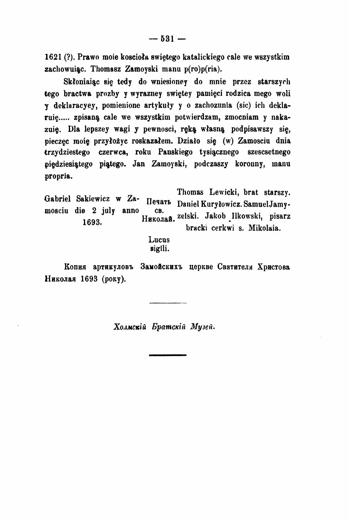 Копия артикуловъ Замойскихъ церкве Святителя Христова