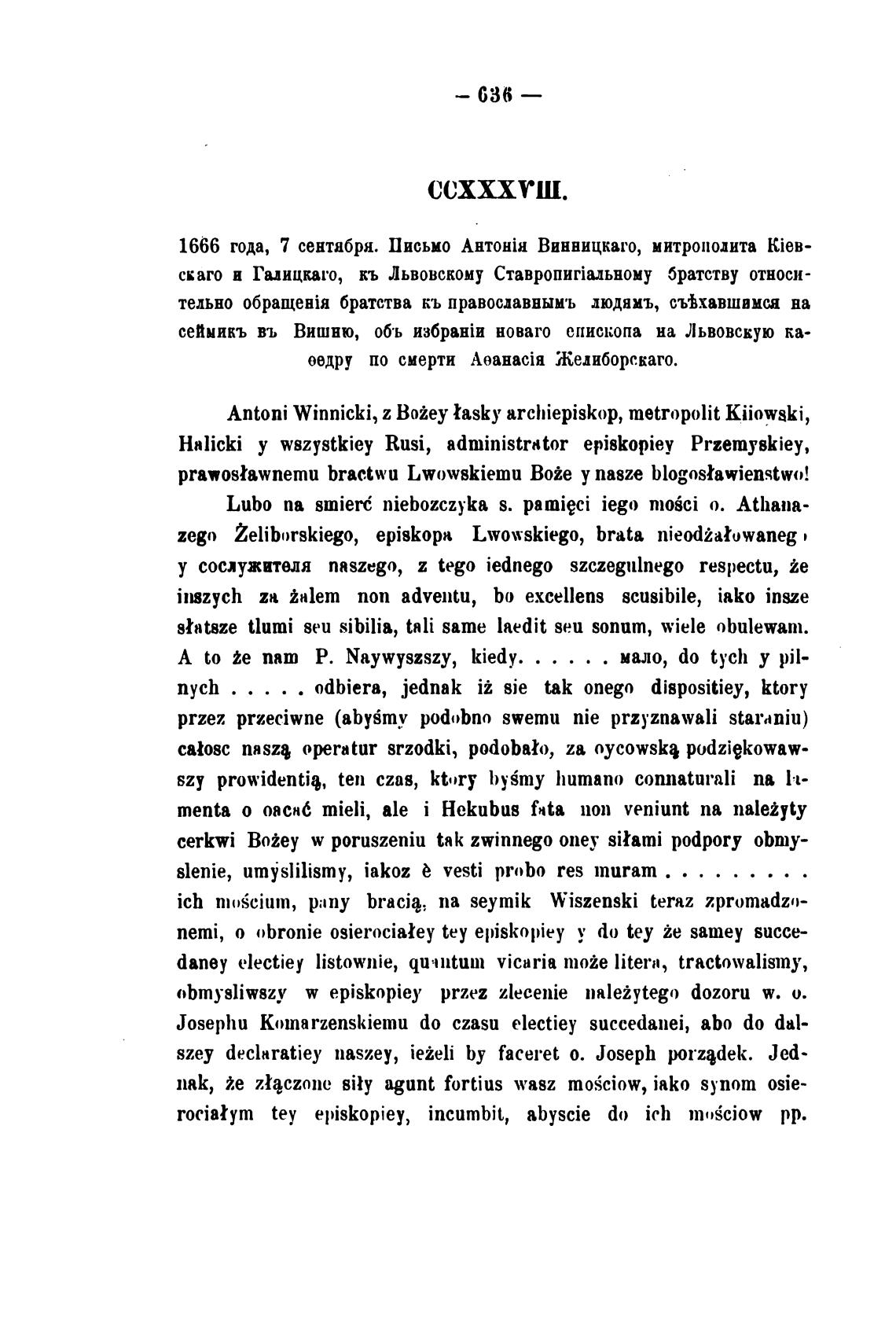 1666 года, 7 сентября. Письмо AHT0HiH Винницкаго, митрополита kieB-