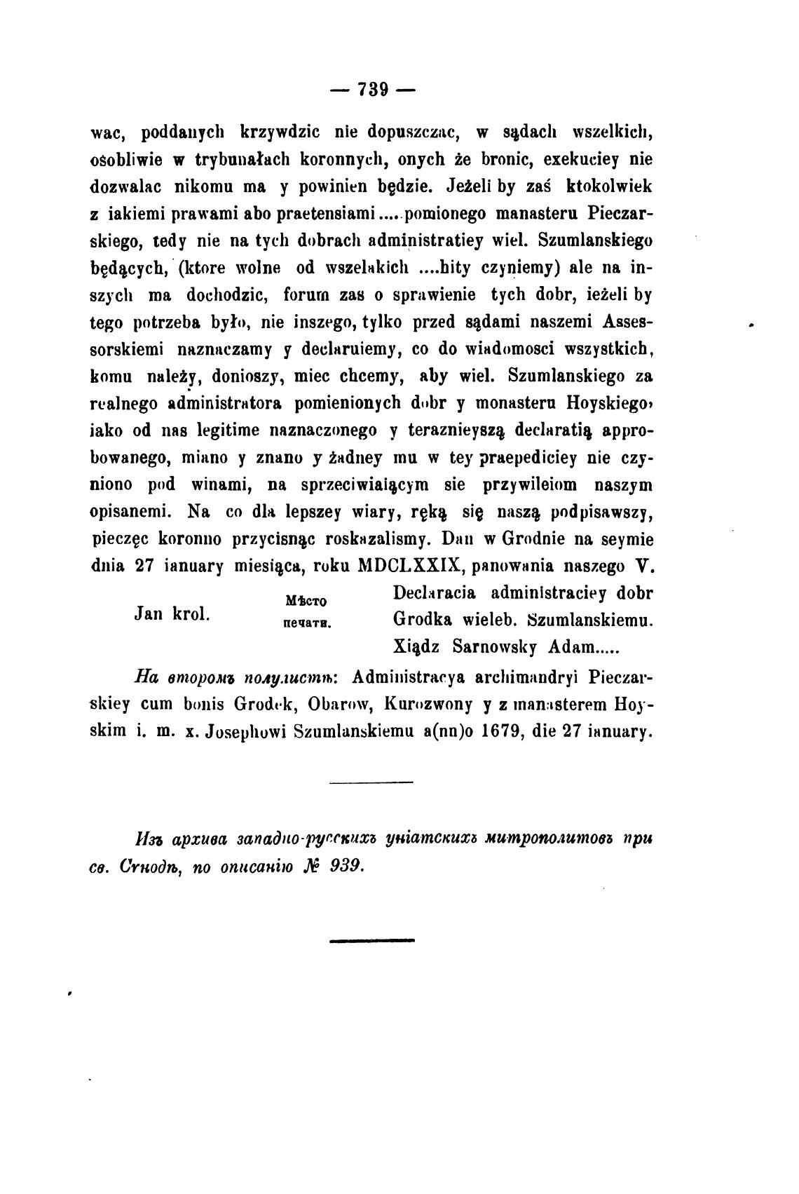 dnia 27 ianuary miesi}ca, roku MDCLXXIX, panowania naszego У.