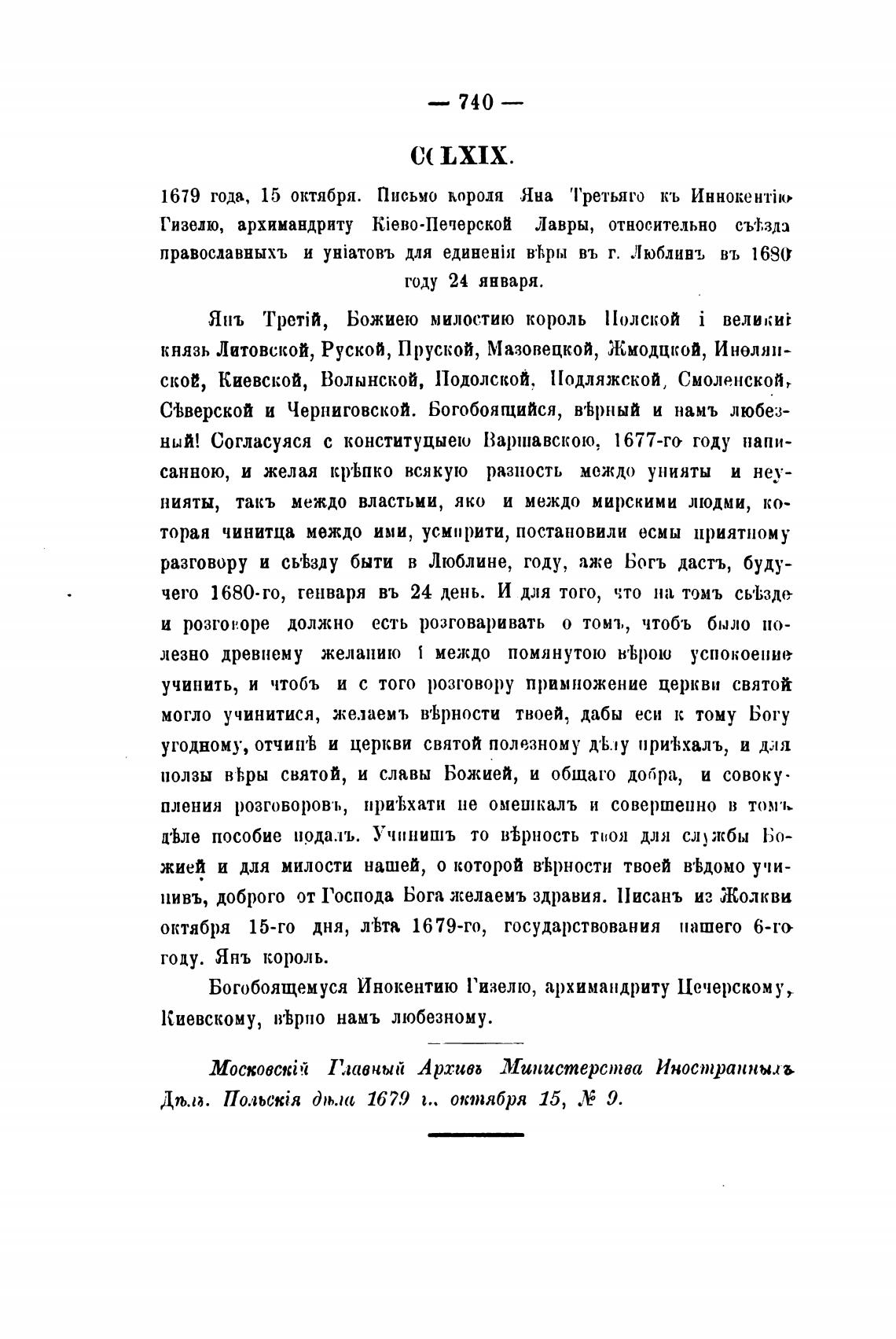 1679 года, 15 октября. Письмо короля Яна '1'ретьяго кь ИннокентПо
