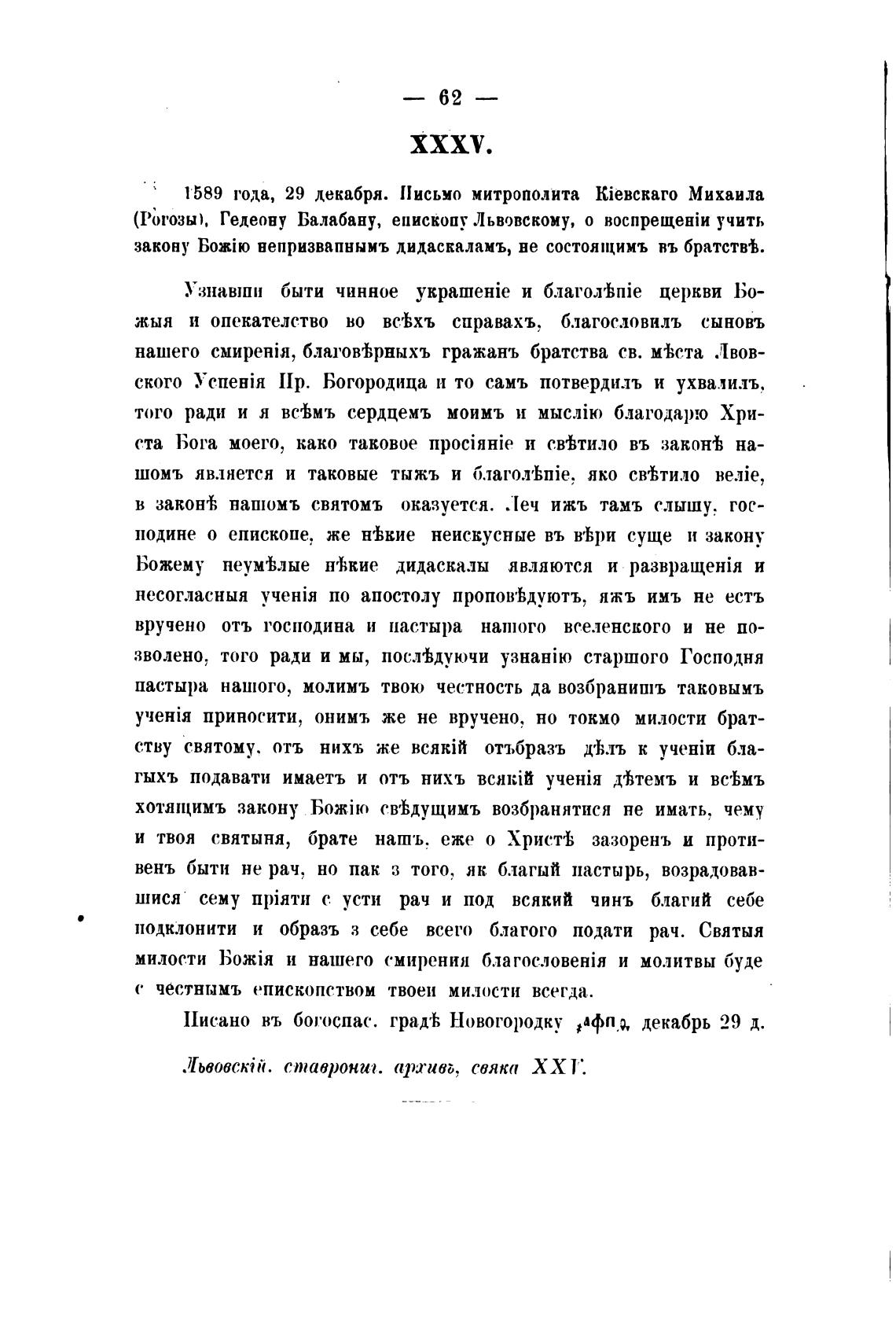 589 года, 29 декабря. Письмо митрополита kieBuaI'0 Михаила