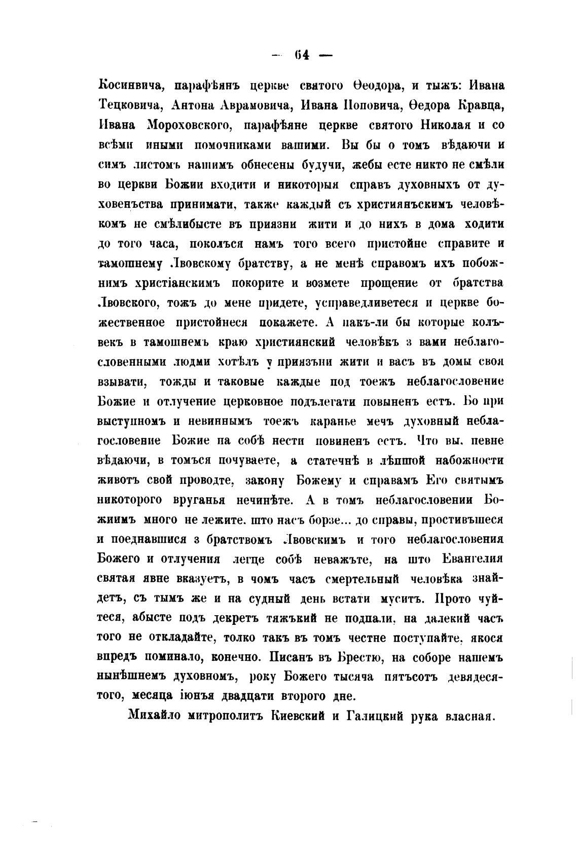 Михайло митрополитъ Киевский и Галицкий рука власная.