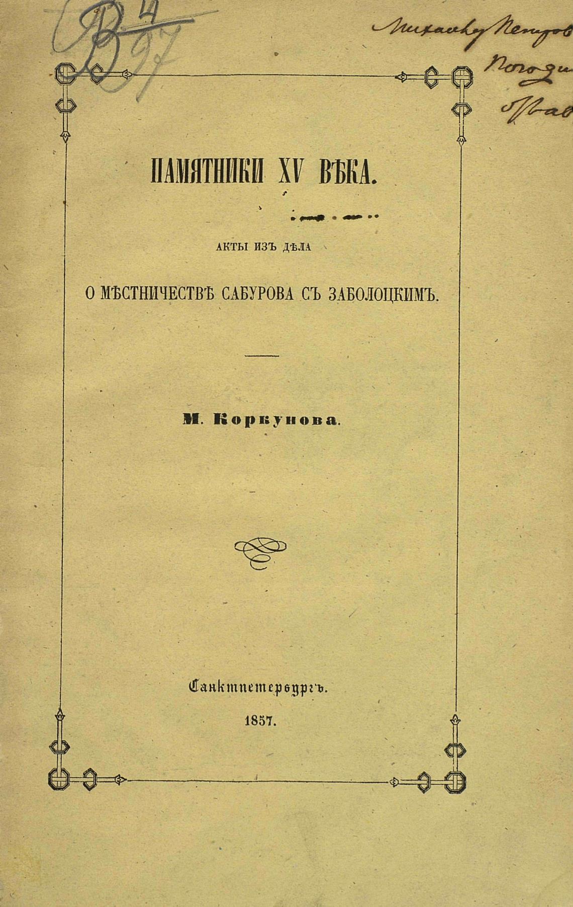 Памятники XV века. Акты из дела о местничестве Сабурова с Заболоцким. - Коркунов М.