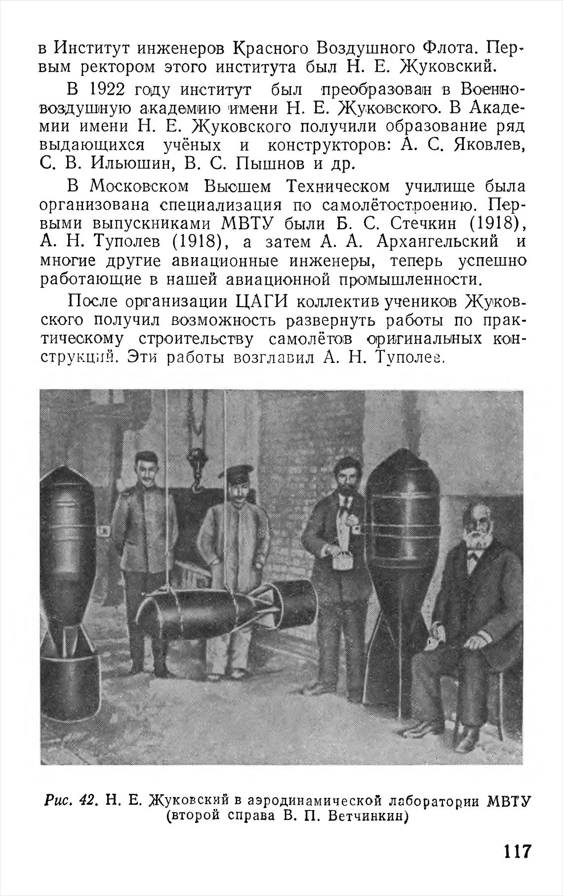 Рис. 42. Н. Е. Жуковский в аэродинамической лаборатории МВТ У