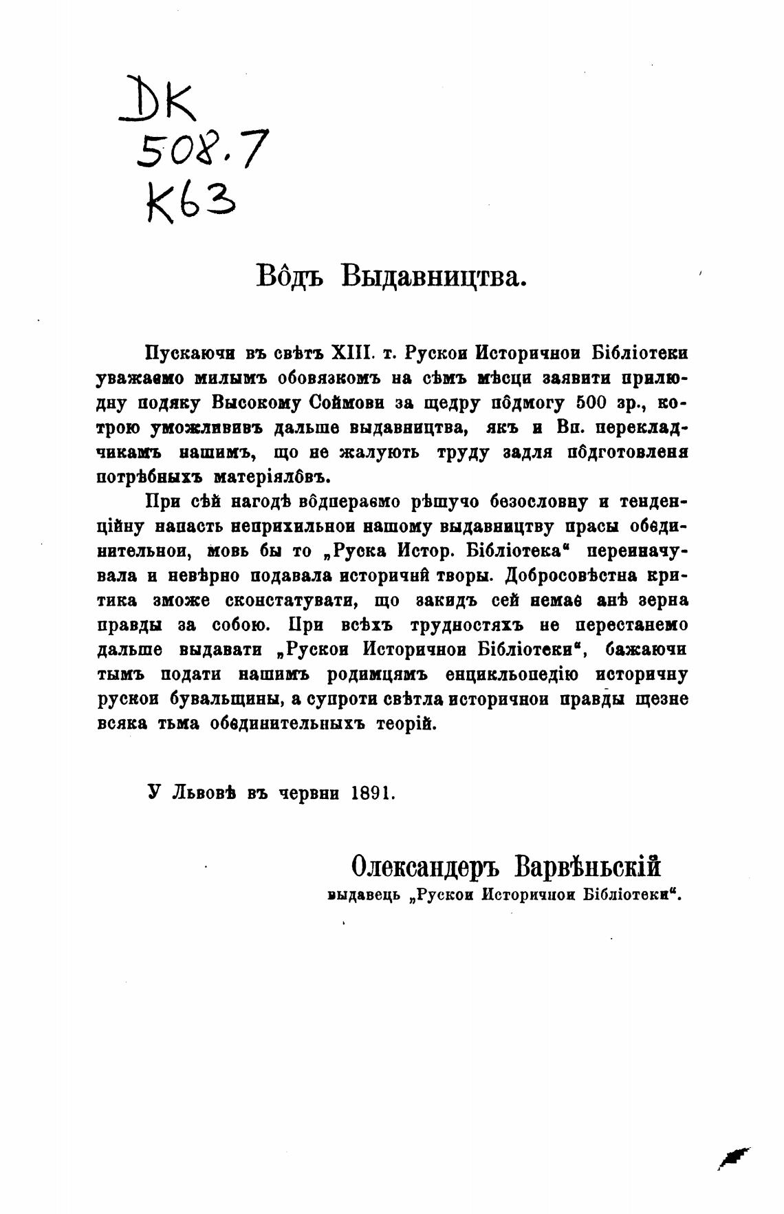Пускаючи въ св'Ьтъ XIII. т. Рускои Историчнои