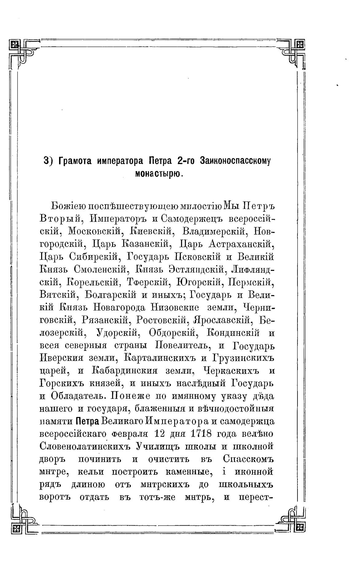 З) Грамота императора Петра 2-го Заиконоспасскому