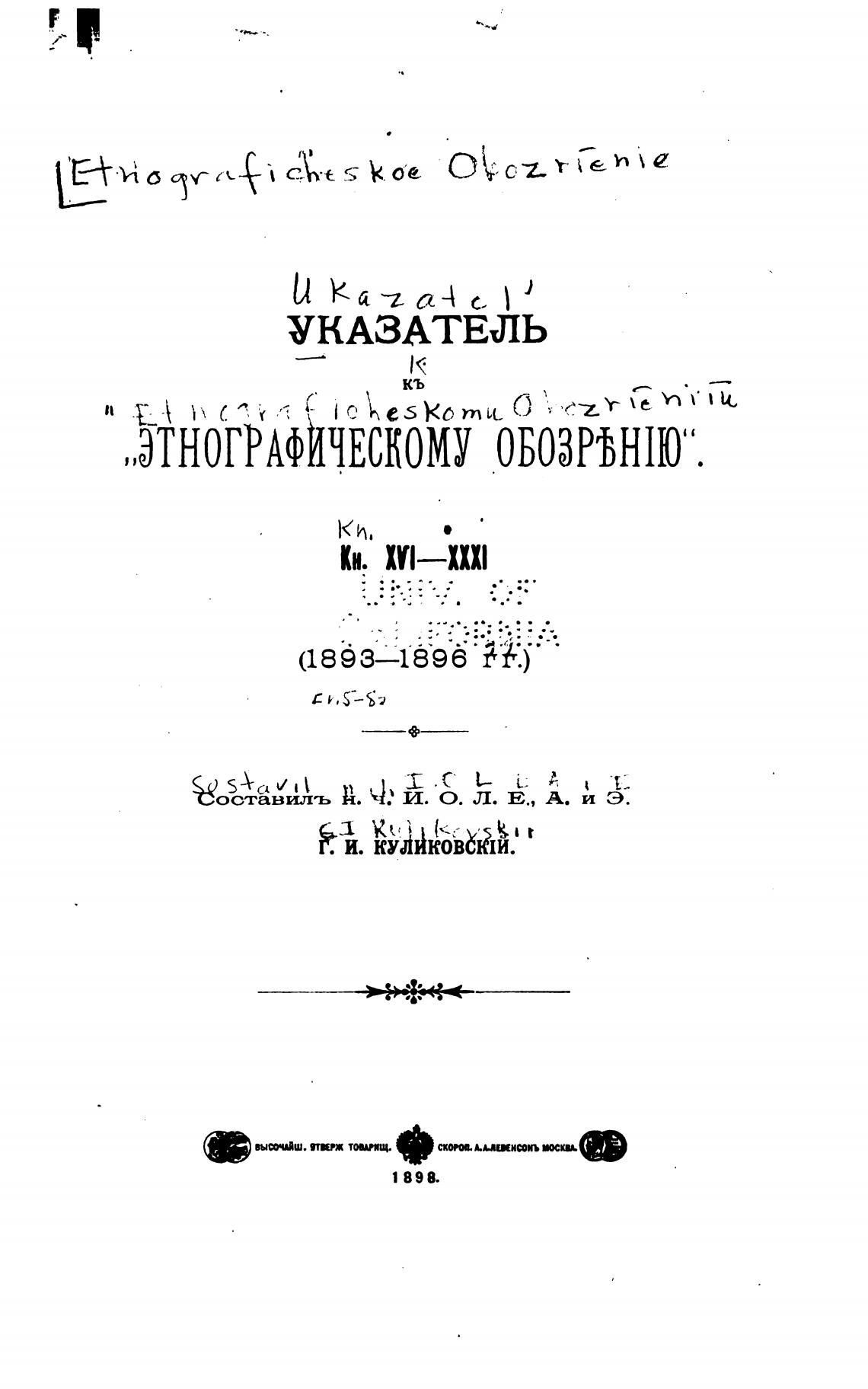 Указатель к "Этнографическому обозрению". Кн. XVI-XXXI. (1893-1896 гг. ). - Куликовский Г. И.