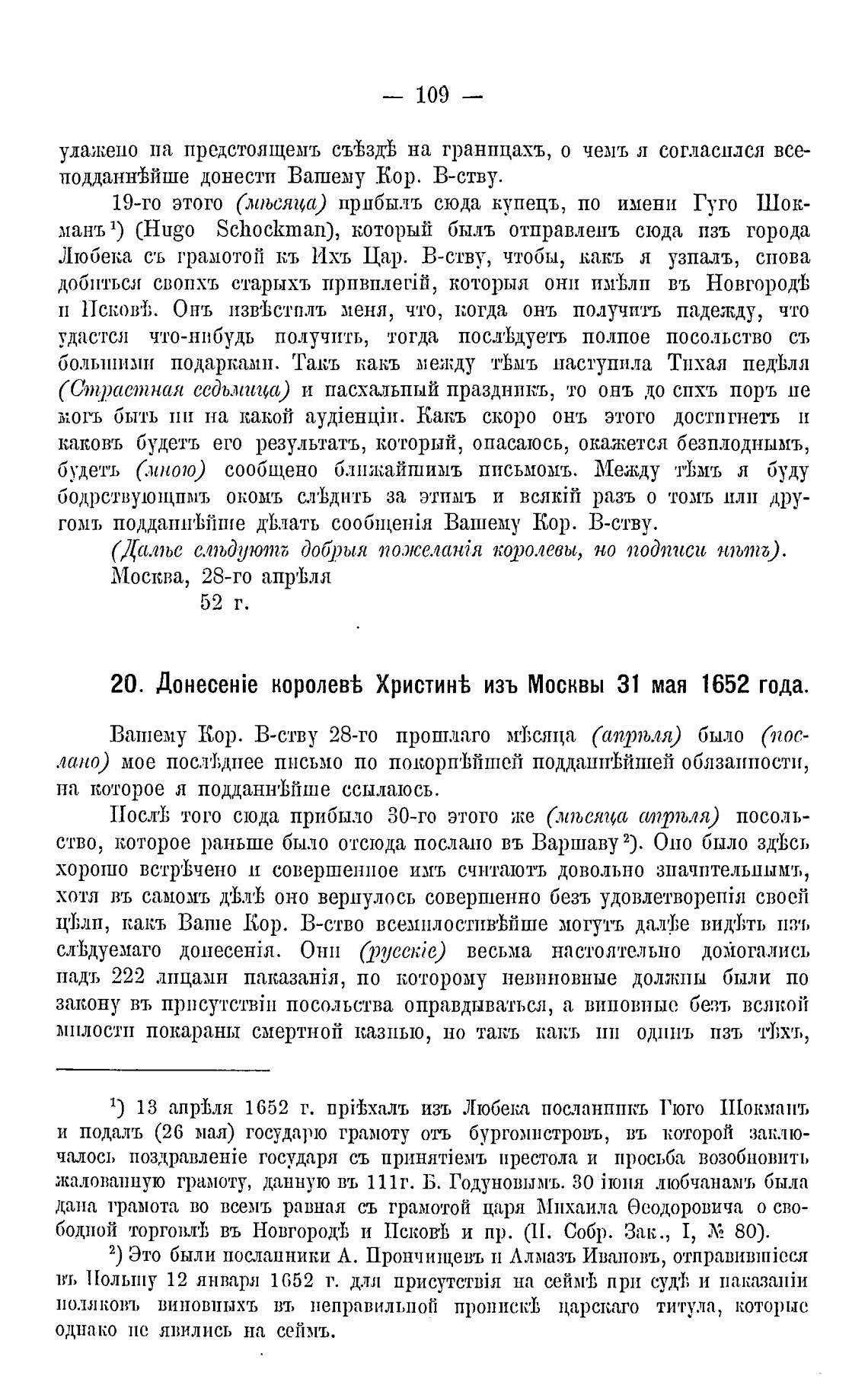 1) 13 апрјзля 1652 г. прй;.халъ изъ Любека пос.ланппкъ Гюго ПГокмапт,