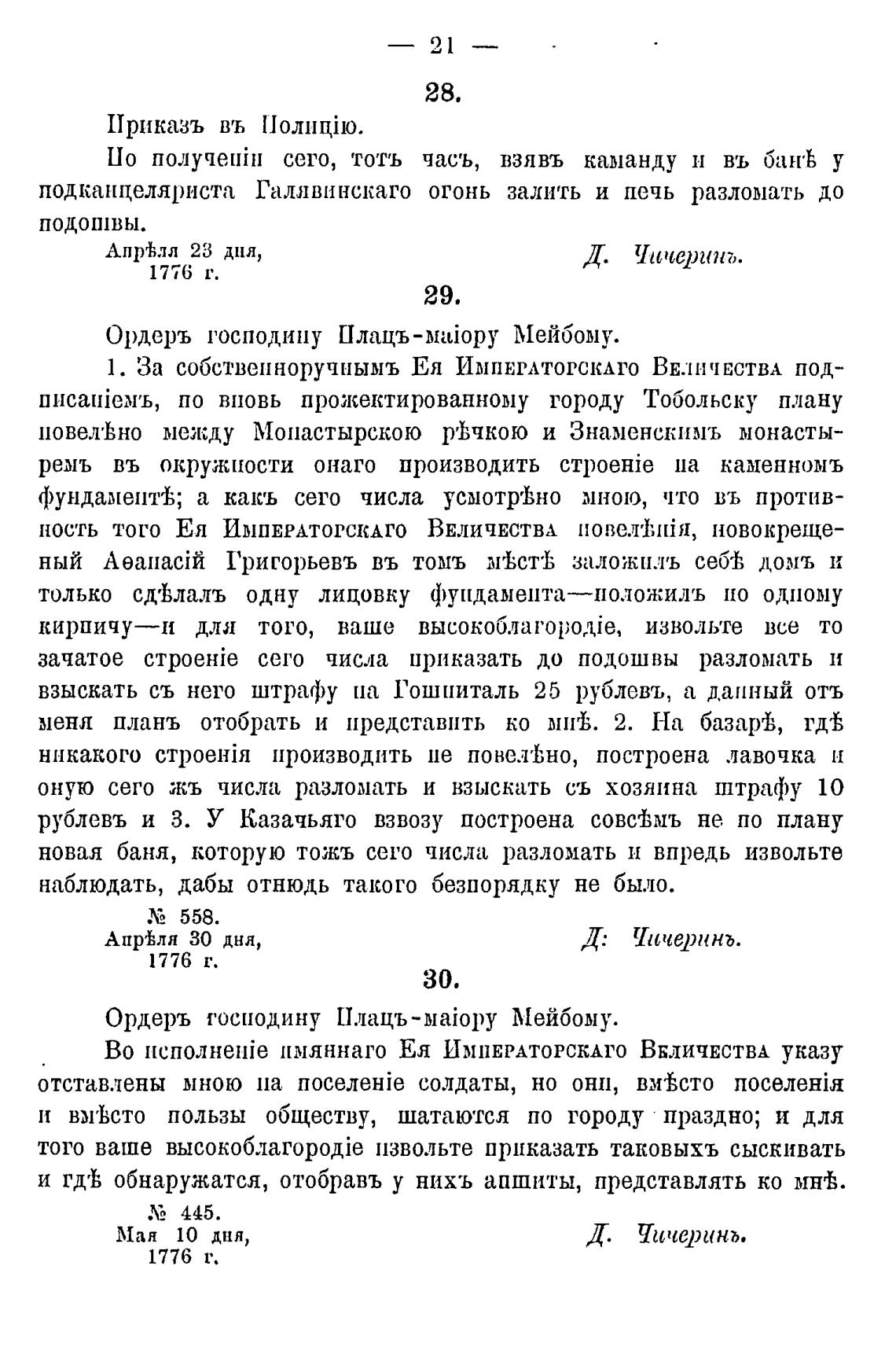 Ордеръ господину Плацъ-маЈору Мейбому.