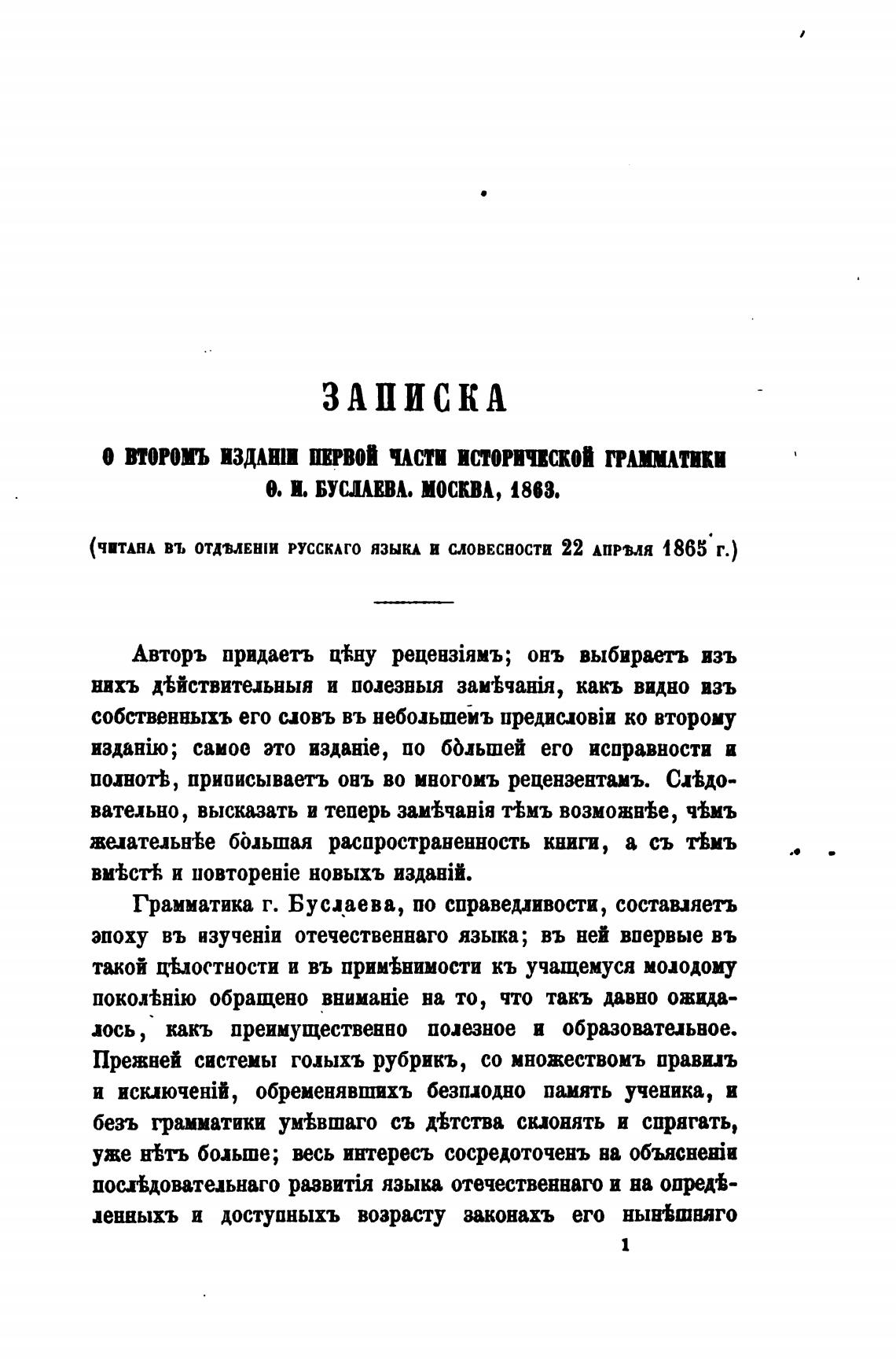 (ЧИТАНА ВЪ ОТДМЕШИ РУССКАГО ЯЗЫКА И СЛОВЕСНОСТИ 22 Апрвля 1865 Г.)