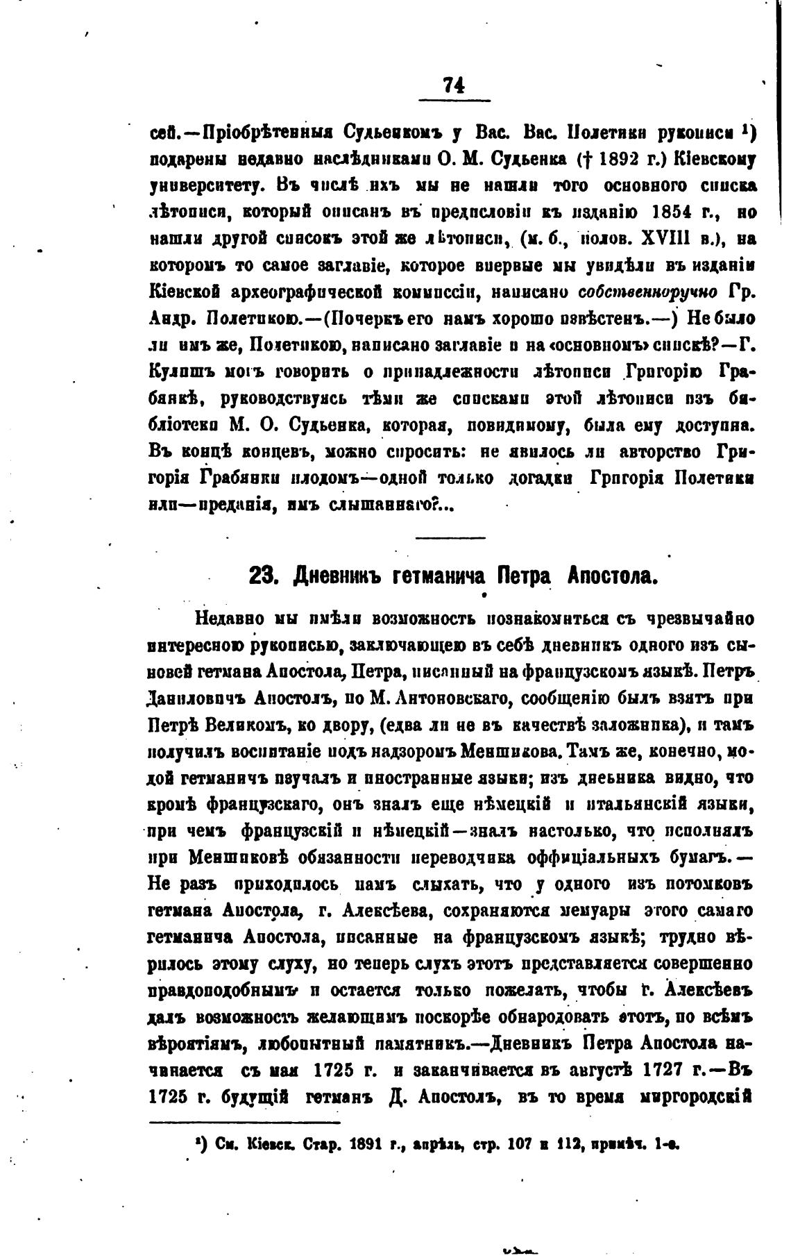 23. Дневникъ гетманича Петра Апостола.