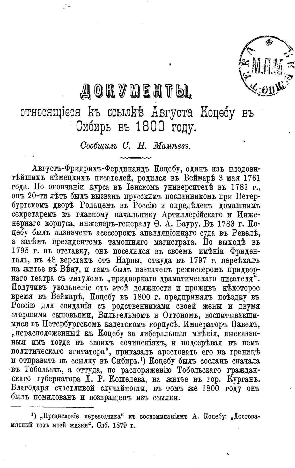 ц отправить въ ссылку въ Сибирь.) Коцебу быль сосланъ сначала