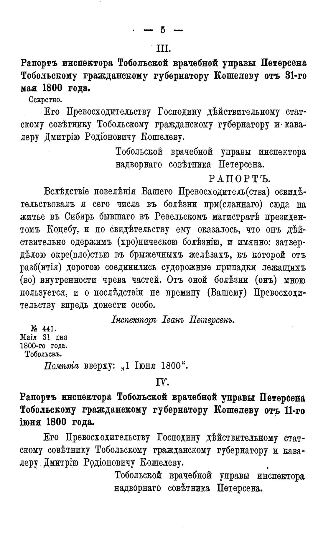 Рапортъ инспектора Тобольской врачебной управы Петерсена