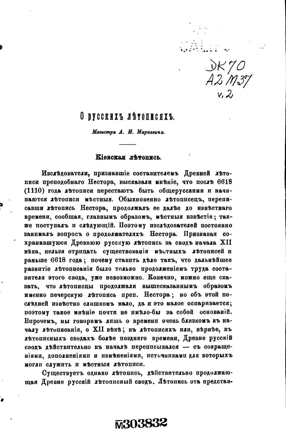 хранившуюся Древнюю русскую Птопись за сводъ начадв XII