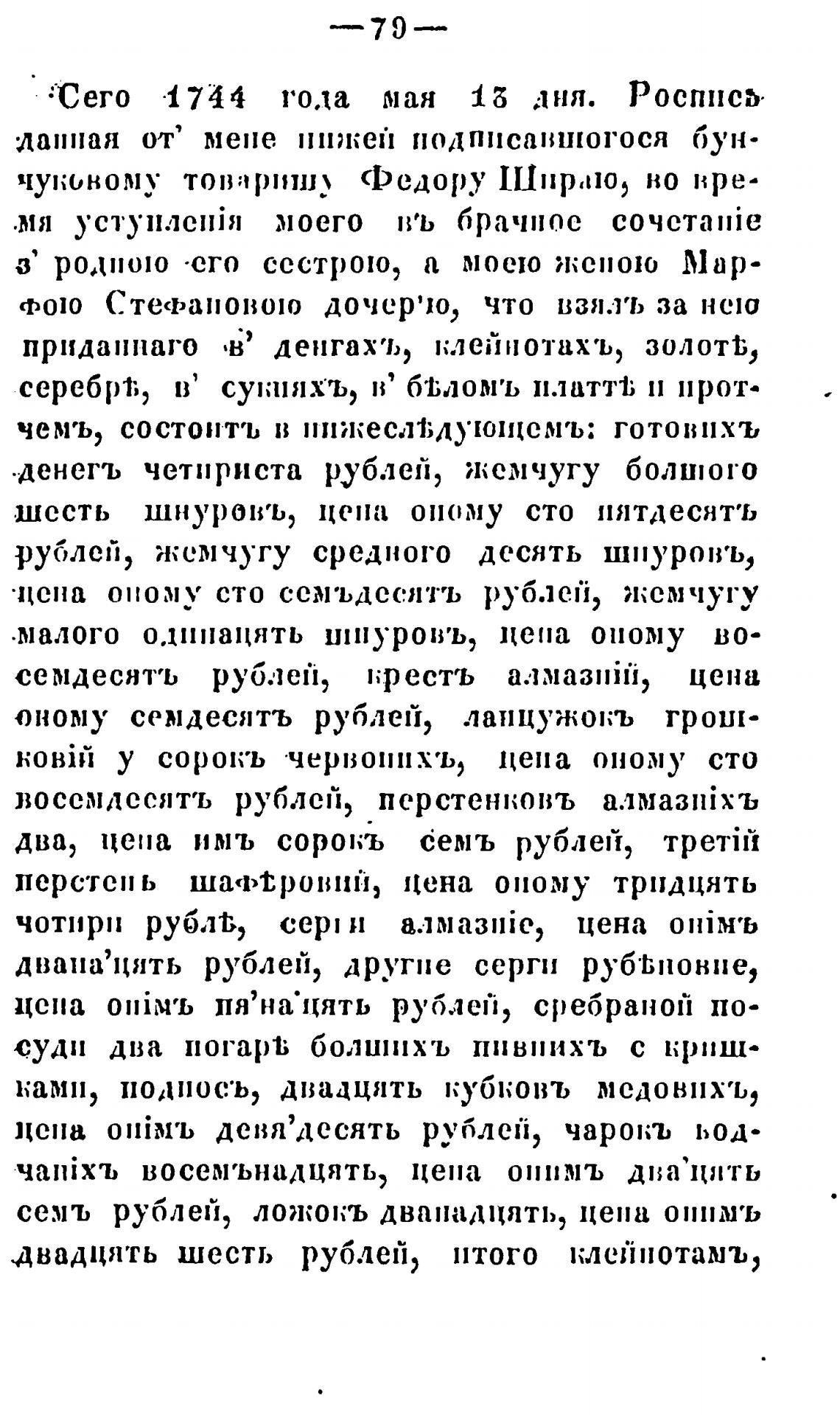 оному семдесятъ рублей,
