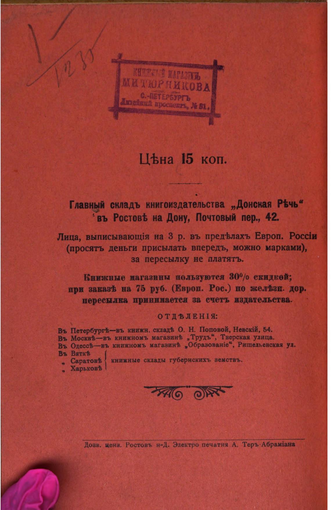 Довв. ценз. Ростовъ н-Д. Электро печатня А. Tepb•A6puiaHa