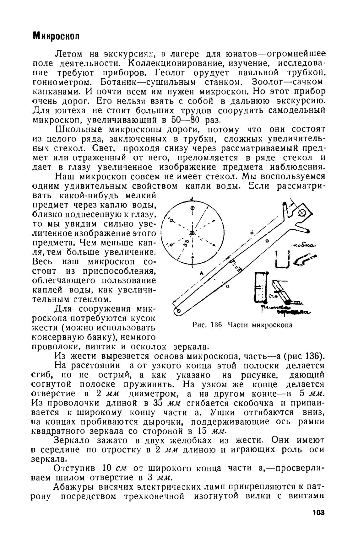 Из жести вырезается основа микроскопа, часть—а (рис 136).