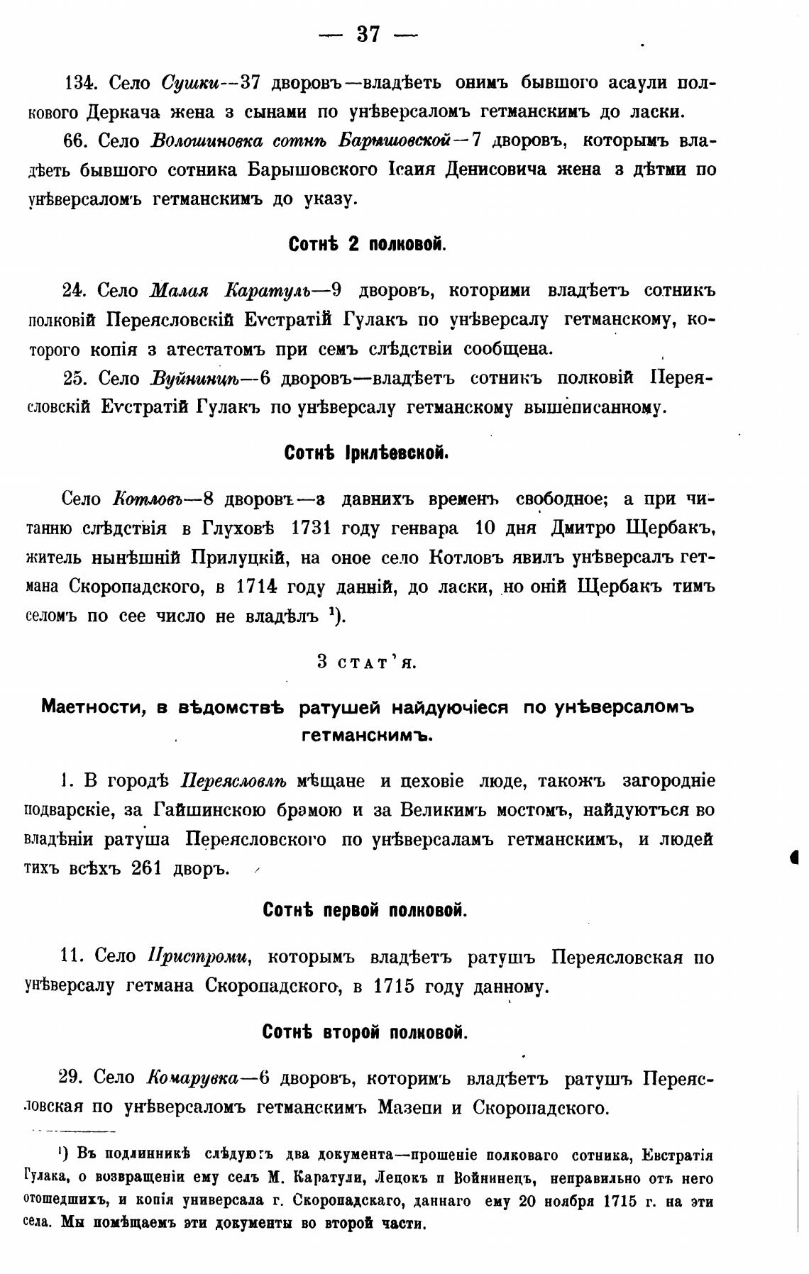 отошедшихъ, и k0tIia универсала г. Скоропадскаго, даннаго ему 20 ноября 1715 г. на эти